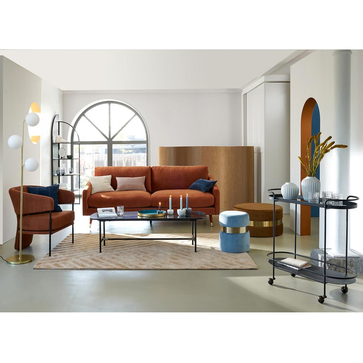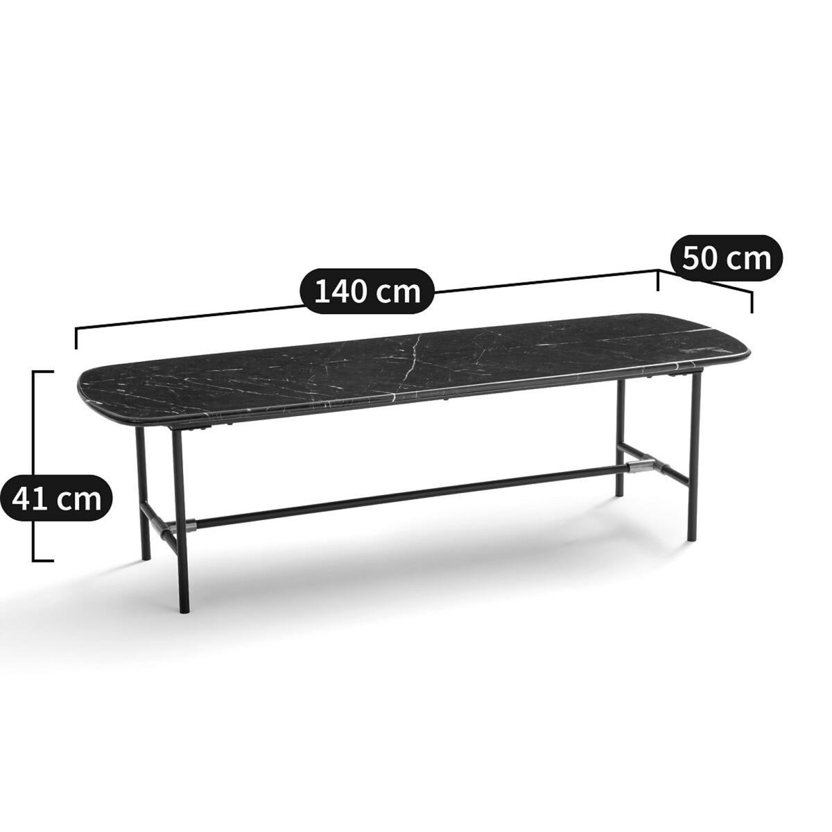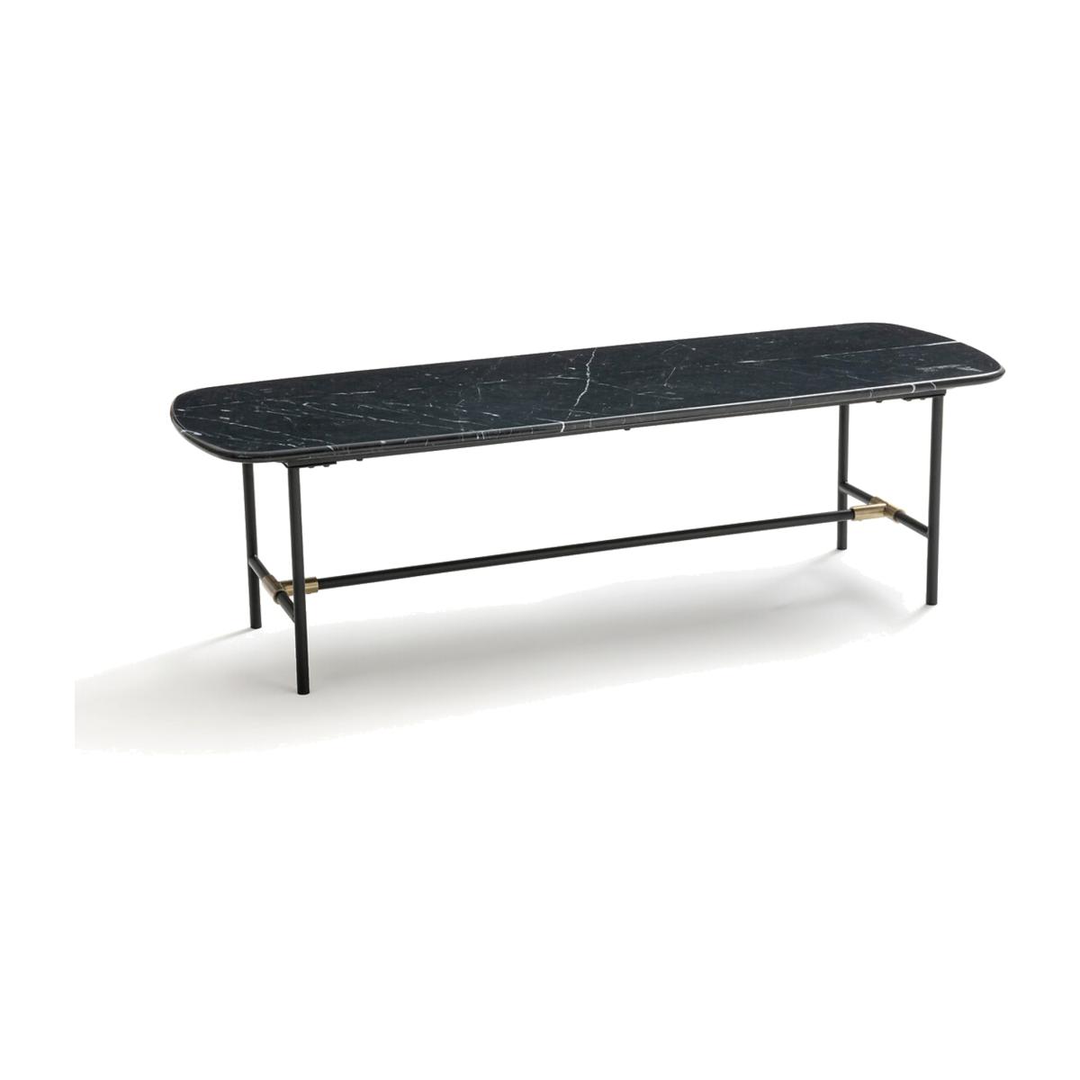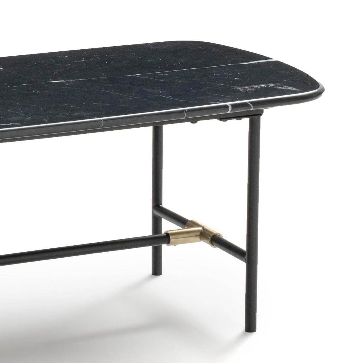 Botello coffee table with black marble top. With a metal base combined with a long and shallow black marble top, the Botello coffee table is at the forefront of modern decor trends. Product Details • Rectangular top in slightly veined black marble • Rounded edges • Steel legs, epoxy paint finish • Brass finish steel base joints • Adjustable plastic feet. Find other models from the Botello collection online. Dimensions Total • Length: 140cm • Height: 41cm • Depth: 50cm. Home delivery:Your coffee table requires self-assembly. It will be delivered to your home by appointment. Note! Please check that all access points are large enough to accommodate your delivery (doors, stairs, lifts).Dimensions and weight of parcel • L149 x H19.6 x D58.5 cm • 48kg