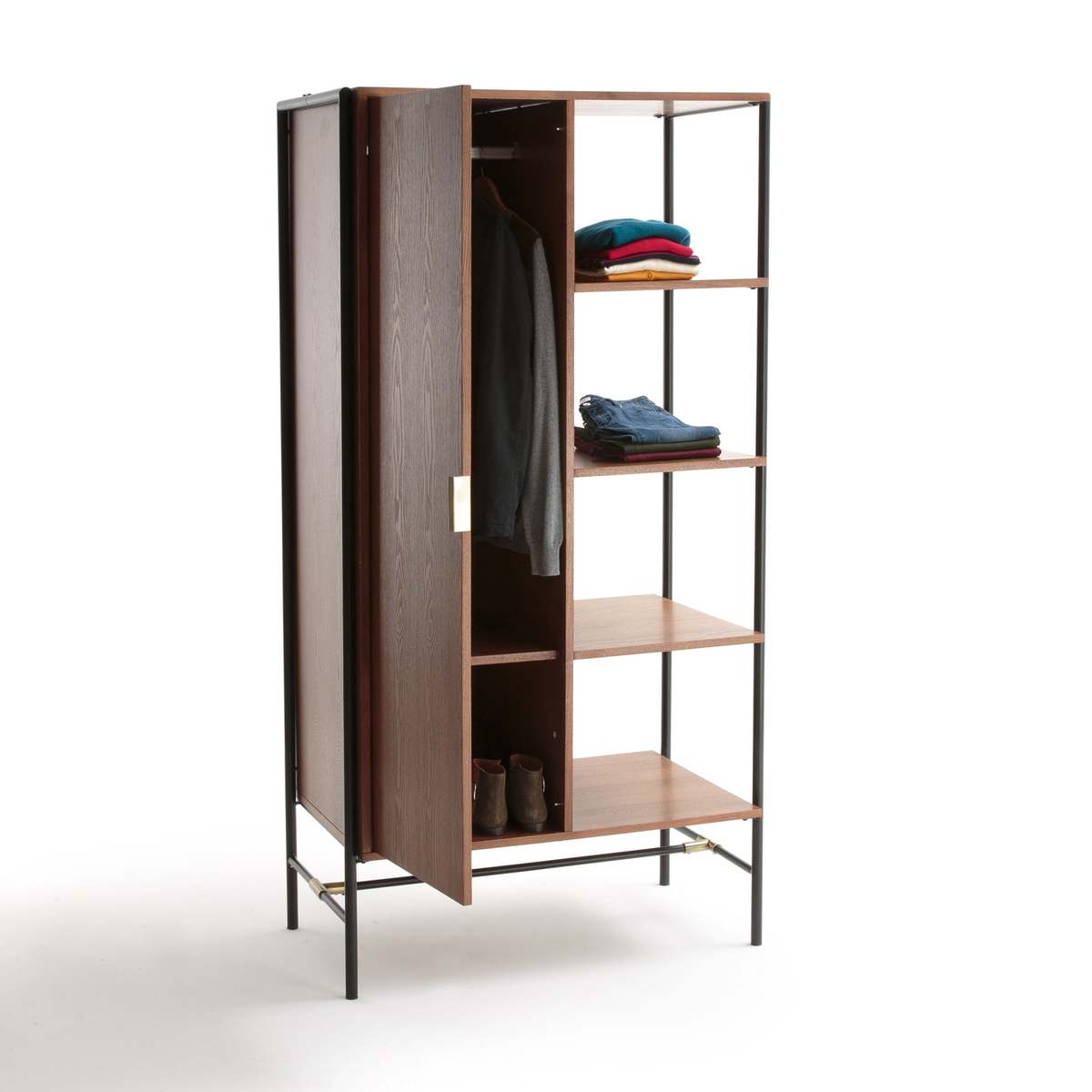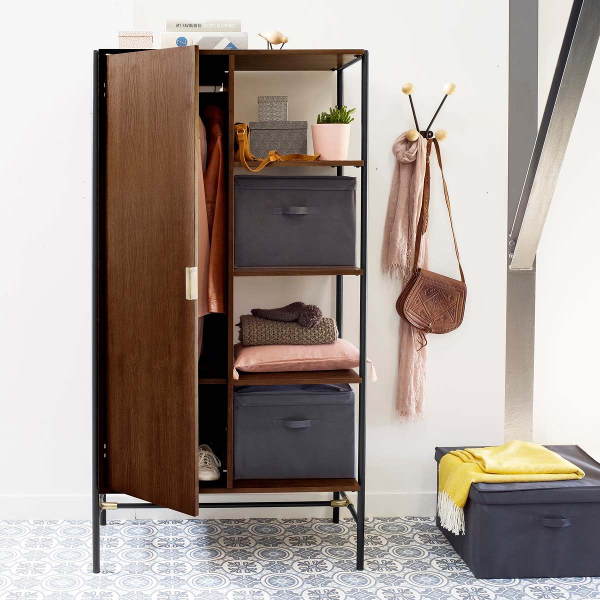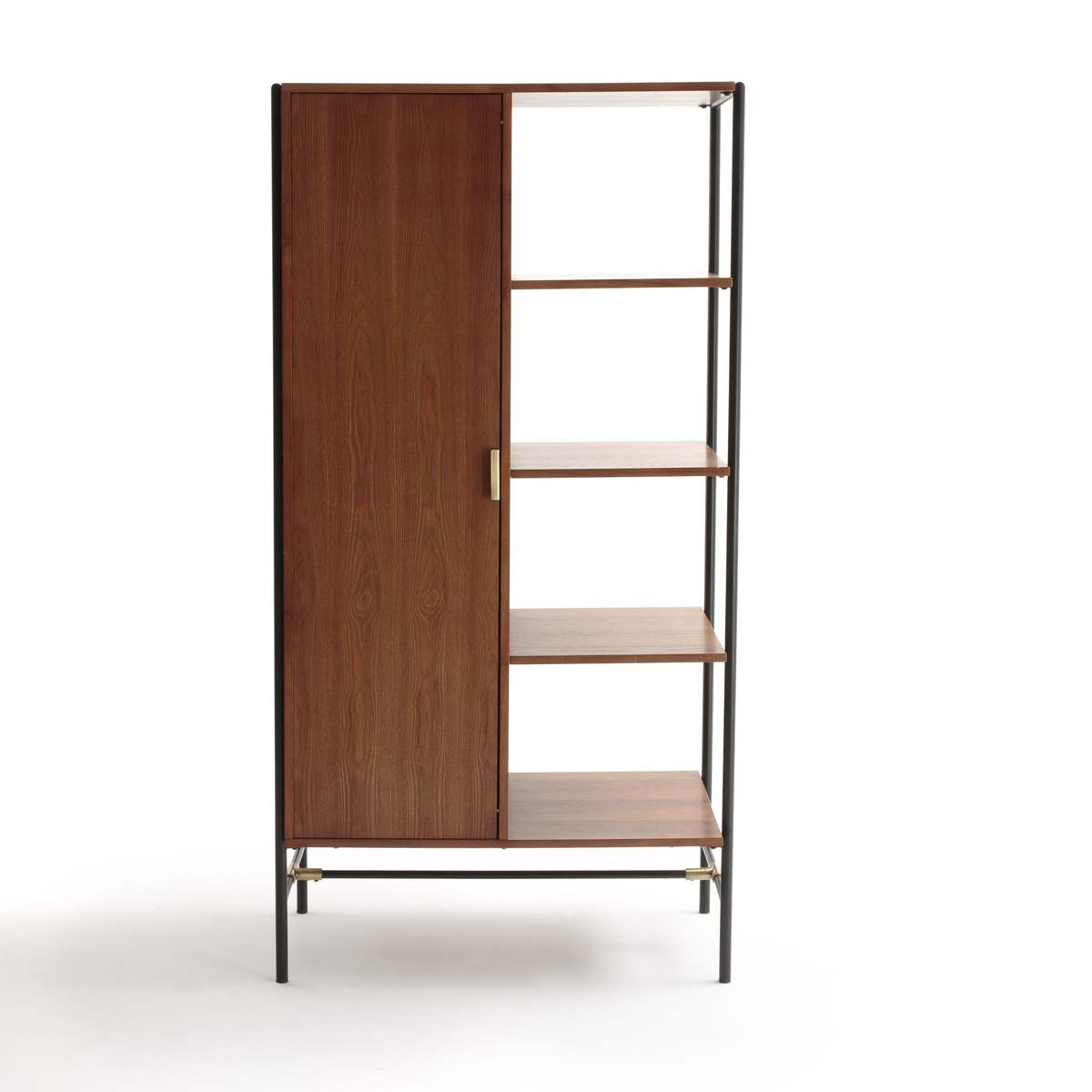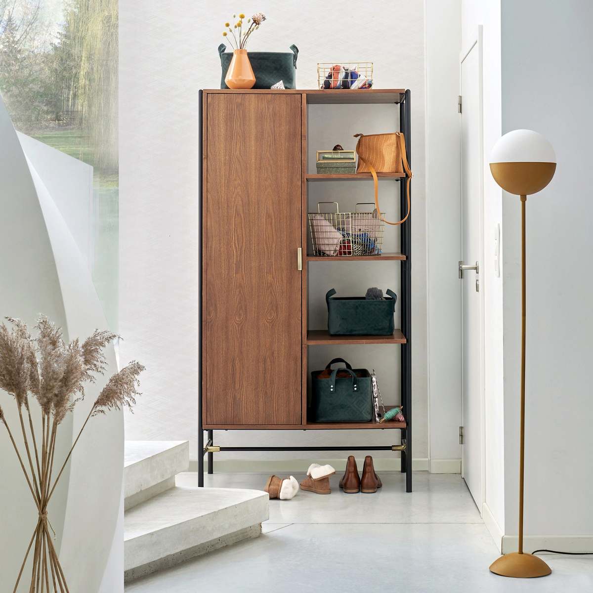 I love this little wardrobe and shelf combo because of its clean lines and versatile design, making it suitable for a variety of interiors, from minimalist to mid-century modern. It works particularly well in small spaces thanks to its clever mix of concealed storage and open shelves, which is great for keeping clutter hidden whilst displaying favourites. Practical styling tips include using the closed section for wardrobe essentials or less visually appealing items, and the open shelves for decorative pieces, books, or plants to add personality. Its warm wood tone combined with sleek metal details makes it adaptable and easy to incorporate into both contemporary and retro-inspired rooms.