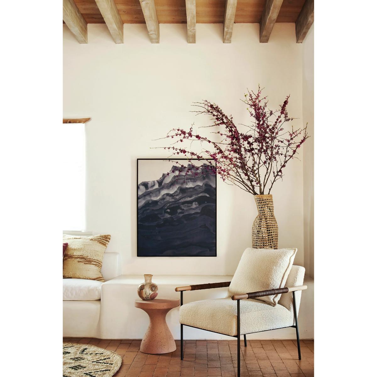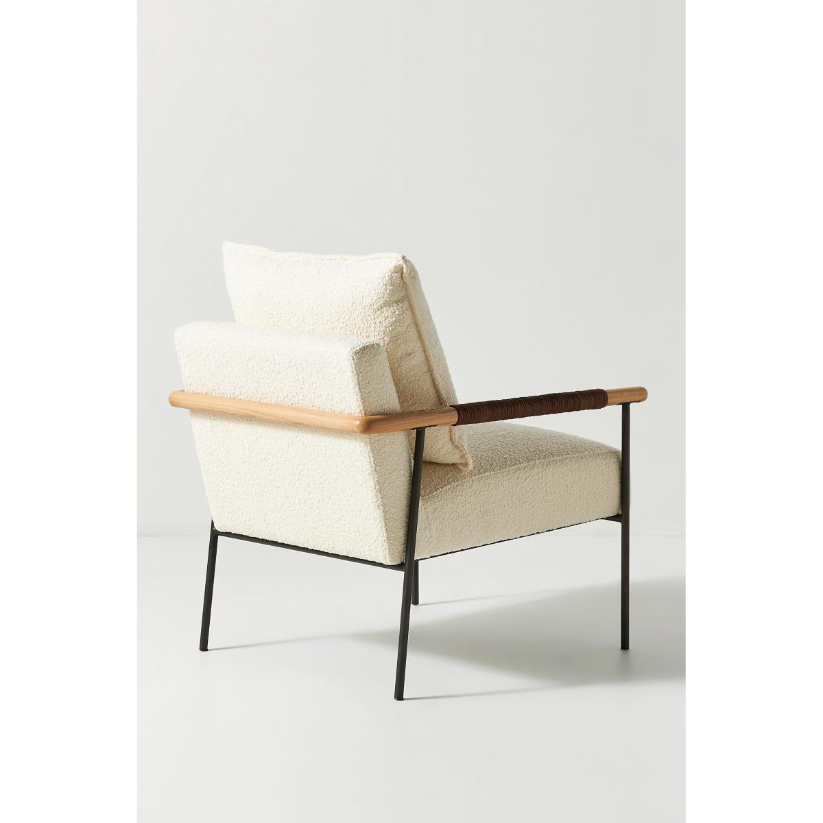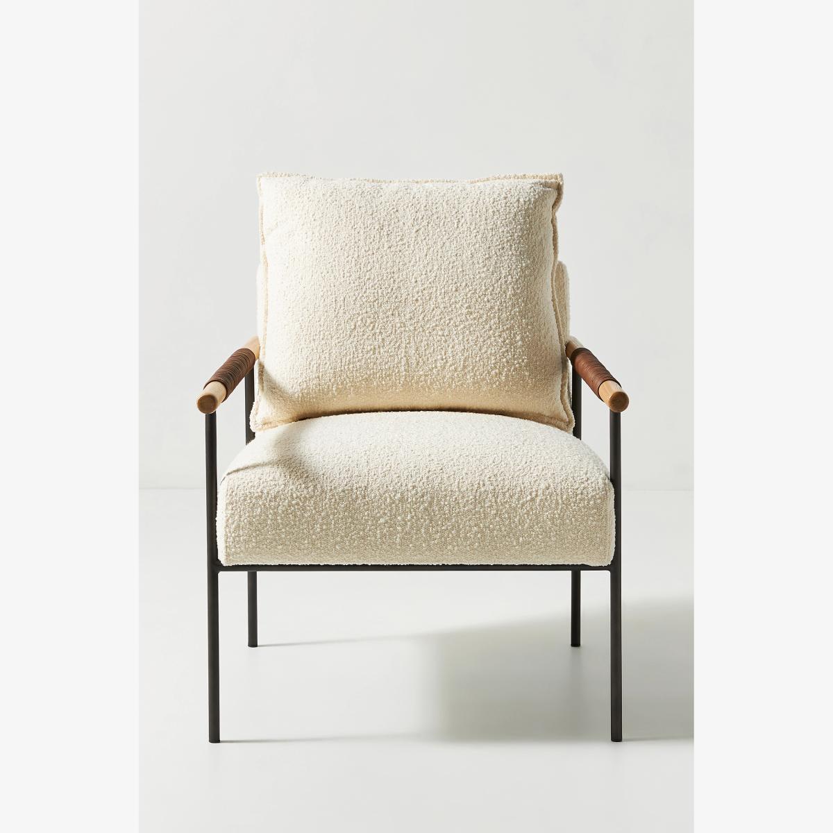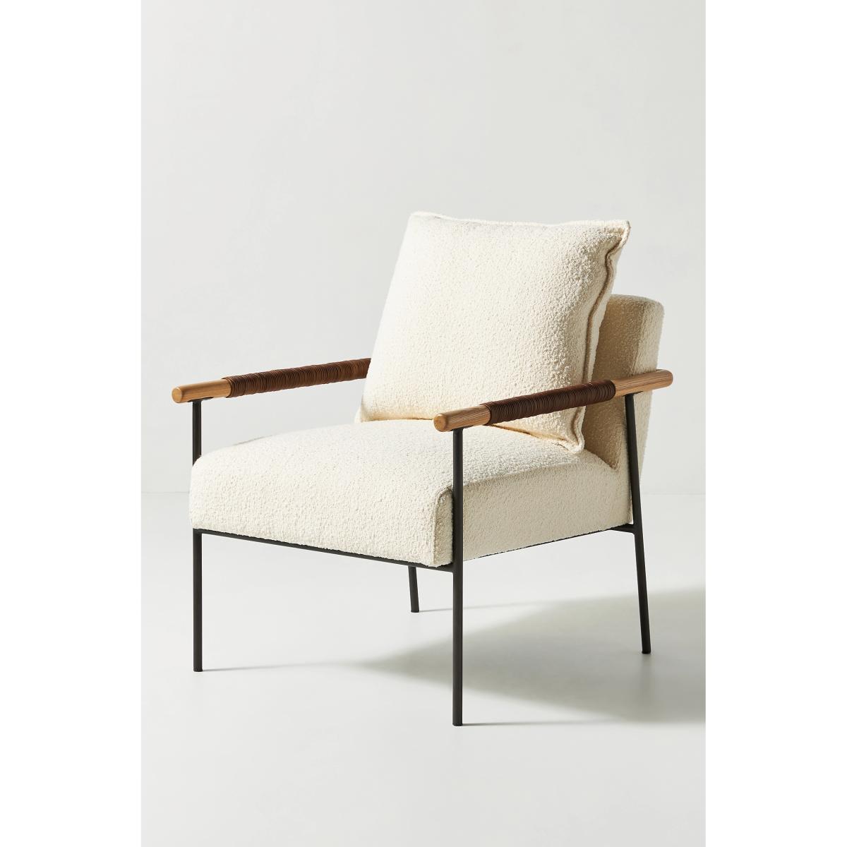 With a deep, sink-into-me seat and a stylish blend of materials, our Atticus Chair features a design you'll appreciate at every angle. Linear ash wood arms wrapped in genuine leather coils offer a warm accent to textured, boucle upholstery, while a slim, steel frame lends a streamlined look that's suited for any contemporary interior. Boucle Atticus Armchair by Anthropologie in White