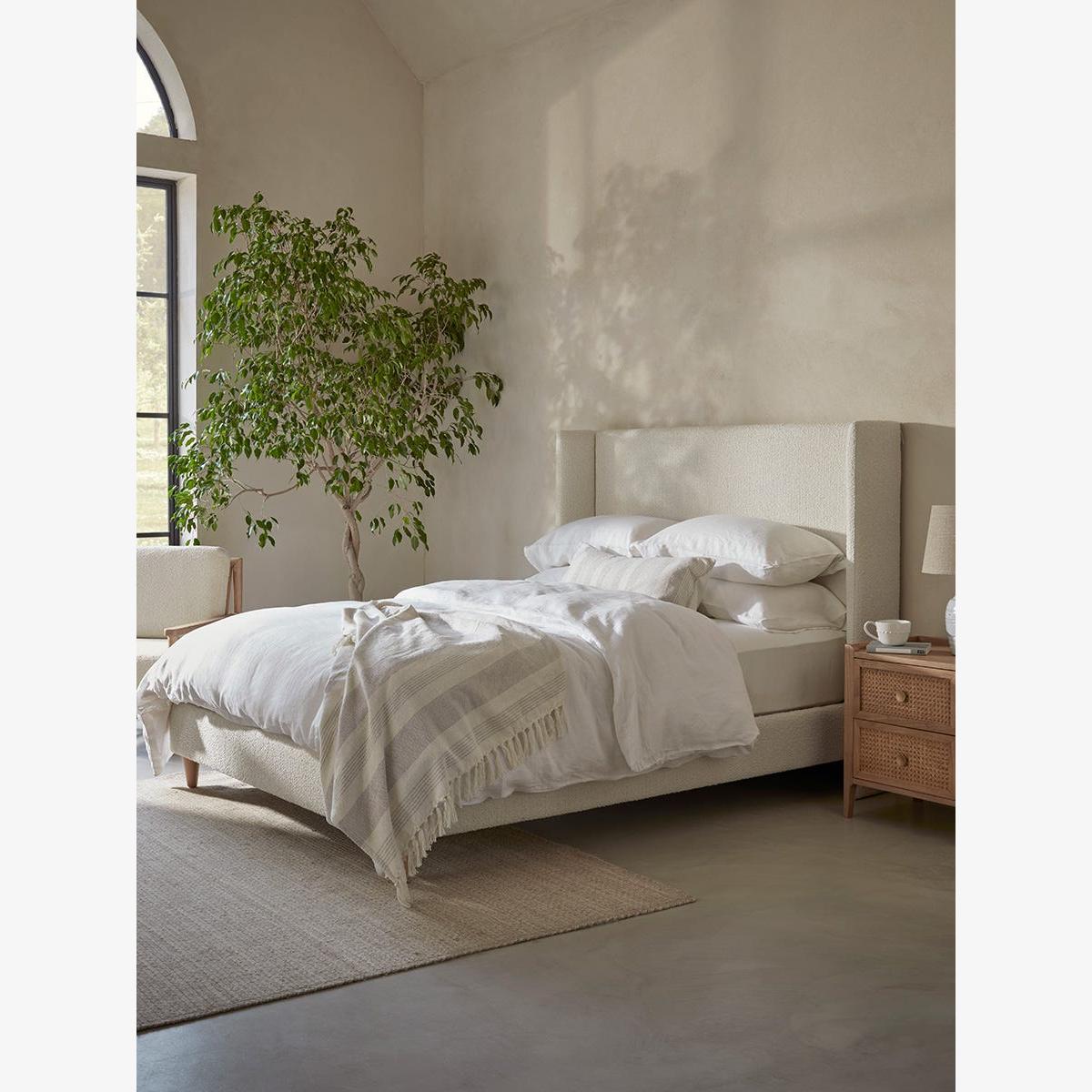 Full of warm and inviting texture, our Bouclé Bed is a luxurious head turning piece for a stylish bedroom. The imposing height of the headboard is softened by the cuddly texture of the cream bouclé upholstery and the winged sides make a cocooning effect for cosy, harmonious nights. The bouclé upholstery continues around the bed base. Half of the bed base lifts to provide a storage void, ideal for seasonal quilt changes and extra pillows.