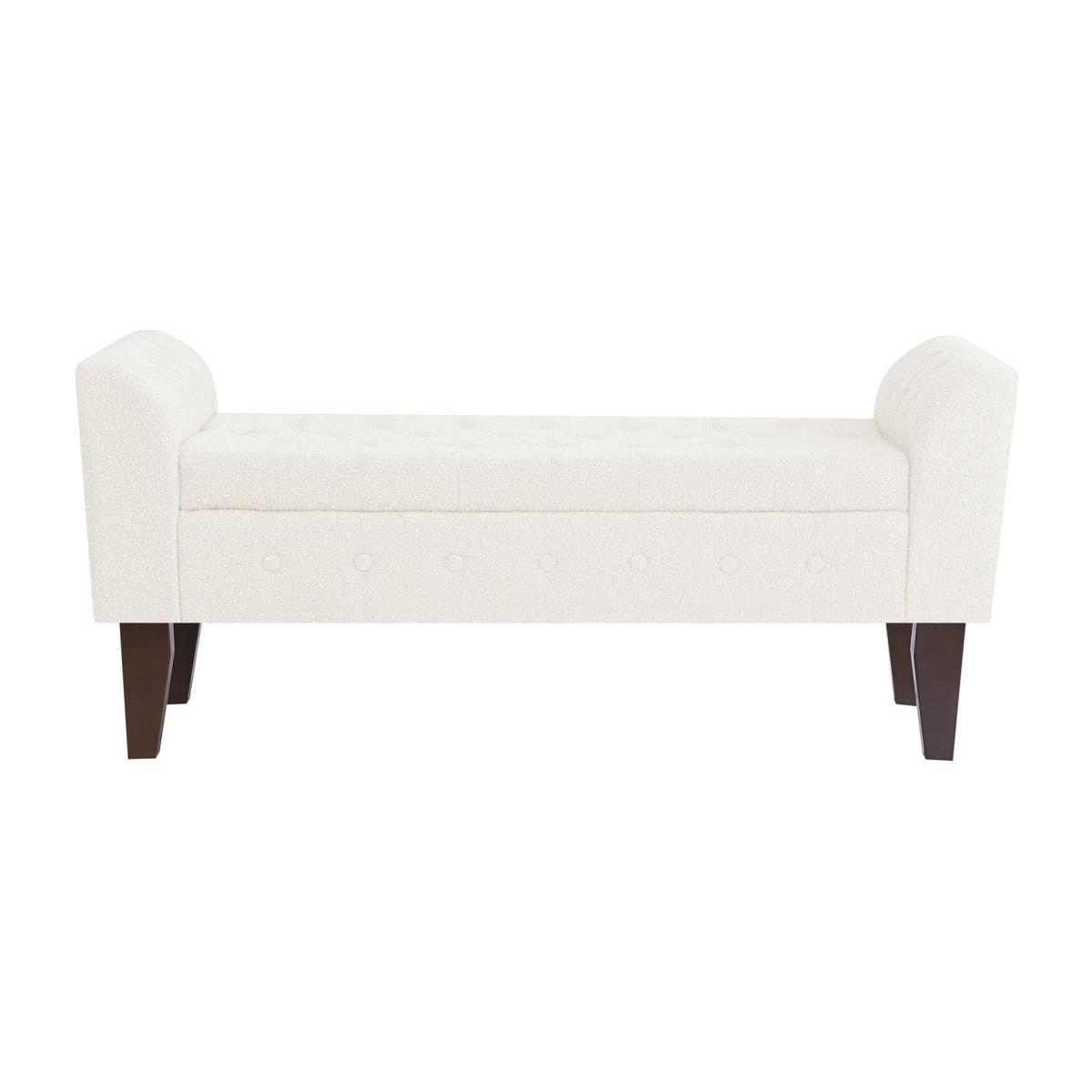 Indulge in elegance and practicality with this sophisticated storage chaise. Its all-over button tufting creates a luxurious look and feel, adding a touch of luxury to any room. Upholstered in premium boucle fabric, this bench combines softness with durability for a truly inviting and long-lasting piece. Assembly of this bench is a breeze, making it easy to enjoy its beauty and functionality in no time. Additionally, the upholstery is relatively easy to maintain, allowing you to keep the bench looking its best with regular care and gentle cleaning. Safety hinges are designed to prevent the lid from slamming shut, protecting the user's fingers and the contents inside. This feature is essential in homes with children or pets, ensuring the lid closes gently and gradually, reducing the risk of accidents and injuries. Secondly, the lined interior of the ottoman adds an extra layer of protection and care for the items stored inside. The lining is a soft barrier between the stored items and the interior surface of the ottoman, preventing potential scratches or damage to delicate belongings. In summary, this elegant storage settee combines luxury and functionality. Its button tufting, premium velvet fabric, and wood legs exude sophistication and class. The hidden storage compartment adds practicality to its design, making it a versatile and stylish addition to any room. With a wide range of colour options and matching pieces, this chaise longue offers endless possibilities for creating a modern and cohesive living space. Dimensions(Legs - 28.6cm H)(Overall - 58.4cm H X 127cm W X 45.7cm D)(Storage Compartment - 45.7cm X 99.1cm X 38.1cm)(Seat Height - Floor to Seat - 43.2cm H)(Overall Product Weight - 19.7kg). Lightly hoover or brush to keep this ottoman looking good.