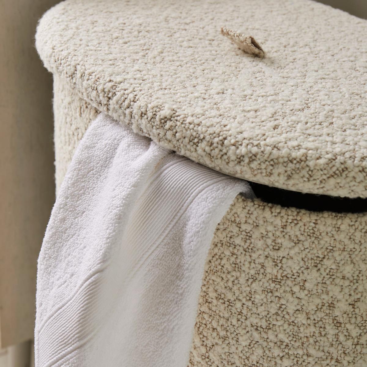 * Boucle fabric * Oval shape * Lidded * Cream colour This laundry basket is a great way to keep your laundry tidy whilst adding style to your bathroom. Finished in a boucle fabric and in a chic oval shape, this will blend wonderfully with a modern or boho interior style. The lid is finished with a fabric loop handle and will keep everything together in between wash days.
