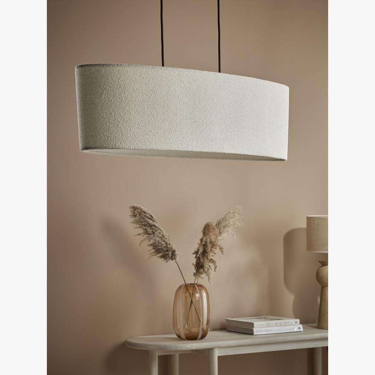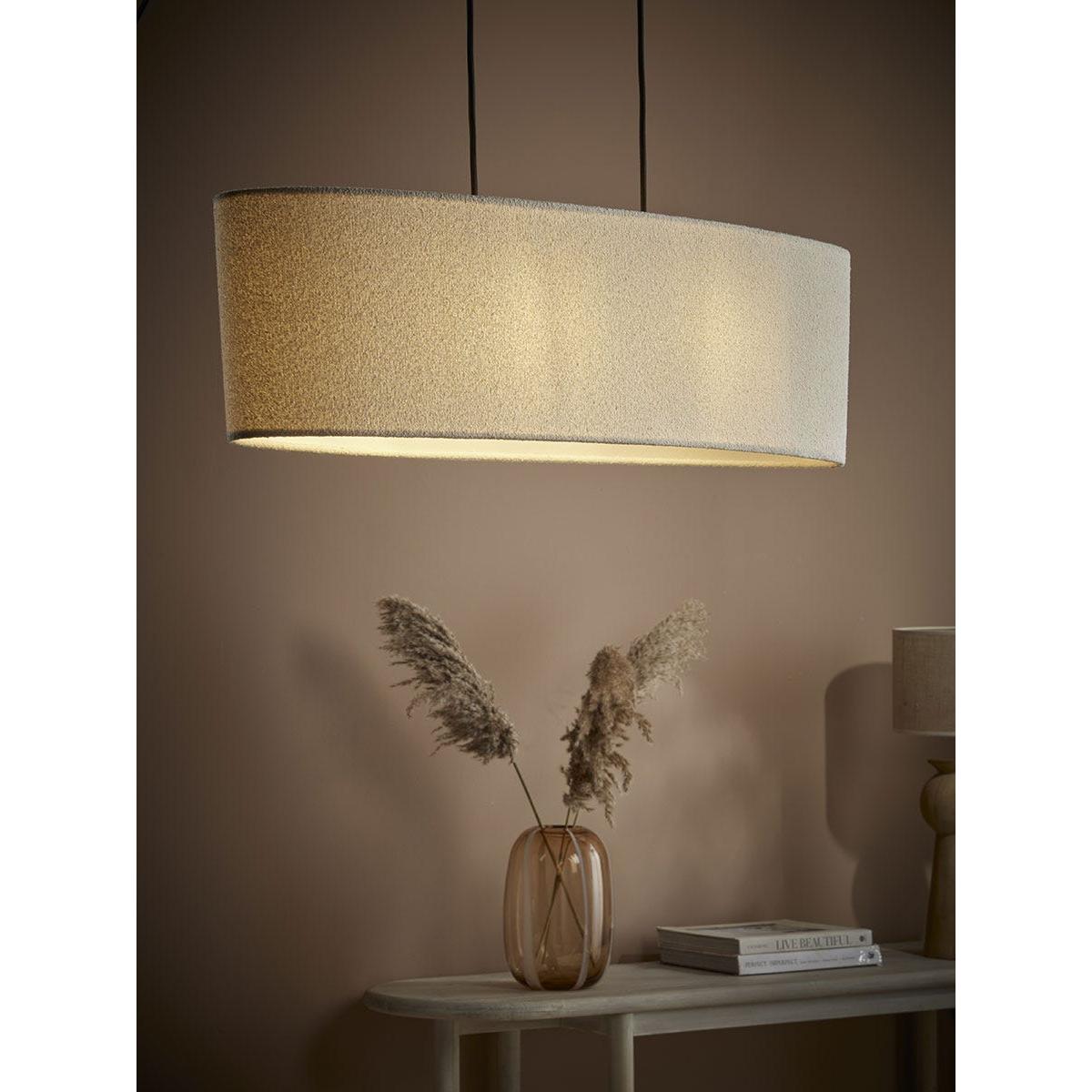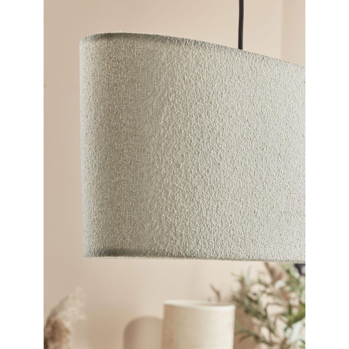 Unique in size and shape, this boucle shade adds a wonderful warmth to your home. Its long oval shape is perfect for hanging over your dining table and adding a welcoming ambience to your dining experience. In neutral tones, the boucle adds a softness to your space, perfect for a variety of interior schemes.