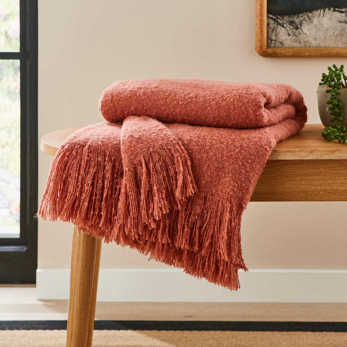 The Boucle Throw is a versatile piece that adds texture and warmth to a variety of interiors. I love it for its rich terracotta hue, which complements both neutral and earthy colour schemes. It works particularly well in cosy living rooms or bedrooms with natural wood or stone accents, adding a layer of tactile comfort that invites you to relax. For styling, drape it casually over a sofa or bed to soften corners, or fold it neatly over an armchair for a polished look. Its size makes it practical for snuggling on chilly evenings, while its textured finish lends visual interest, making it a stylish yet functional addition to your space.
