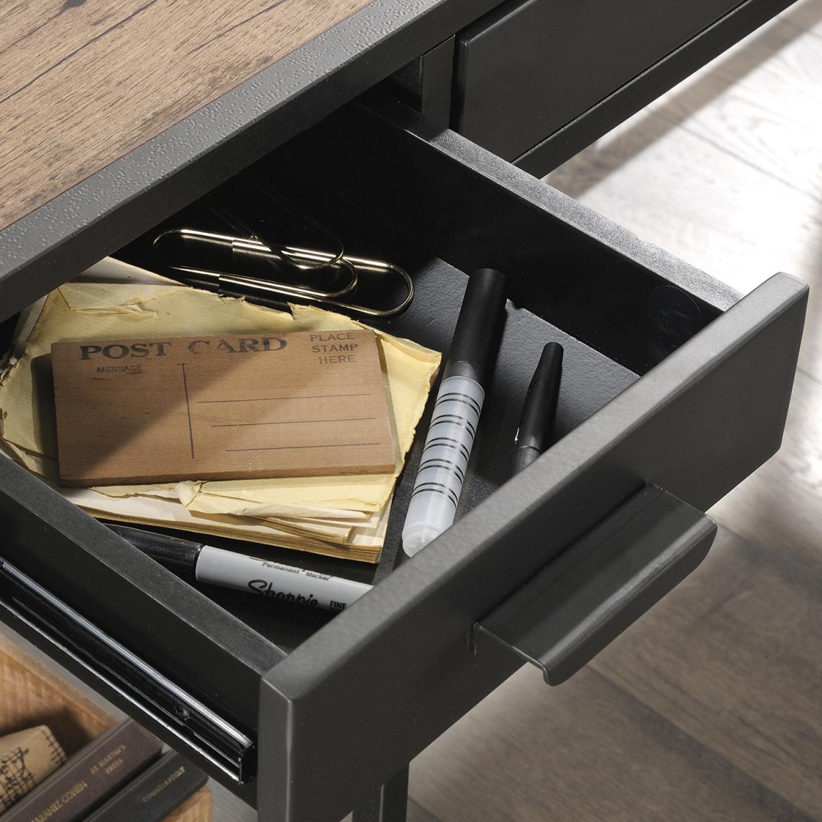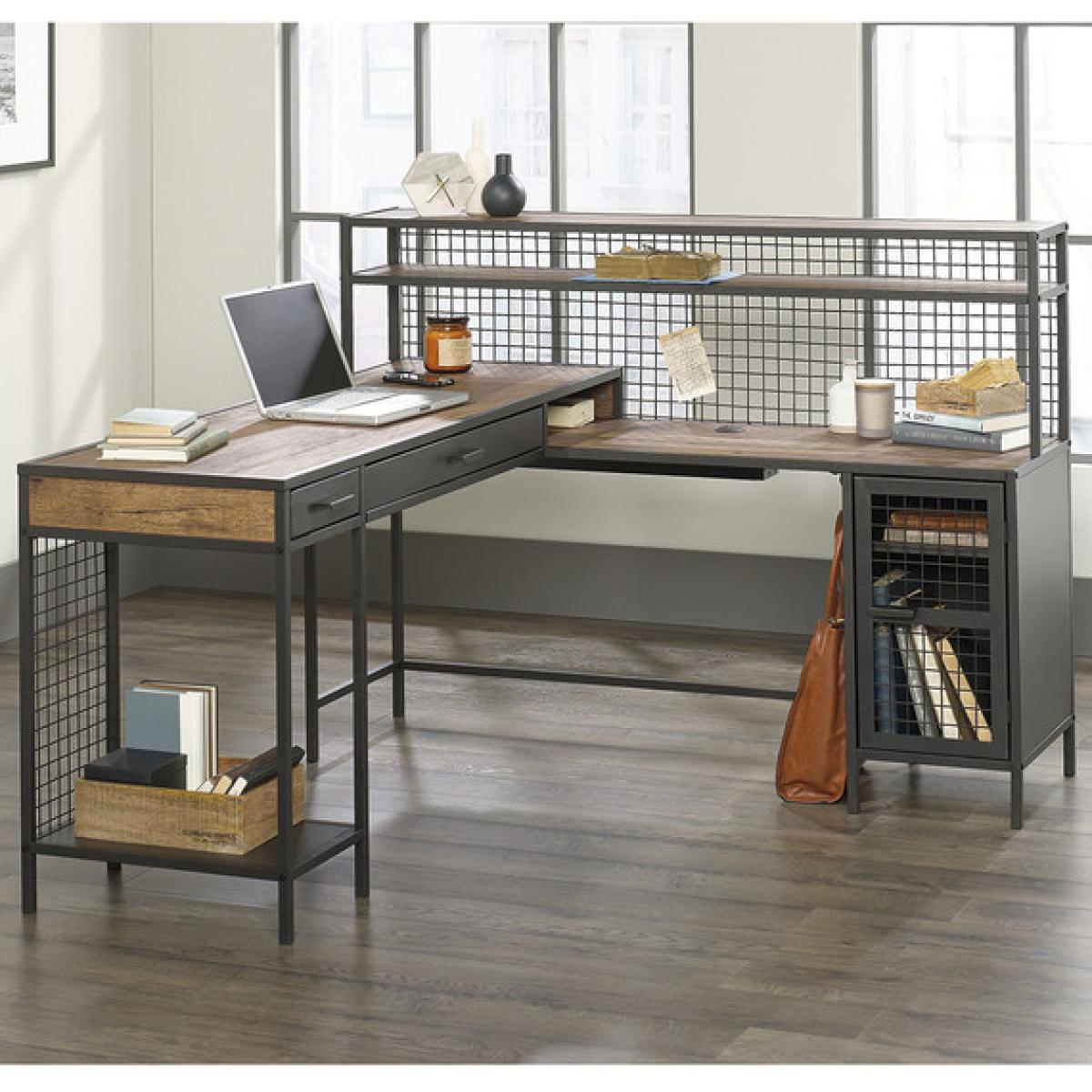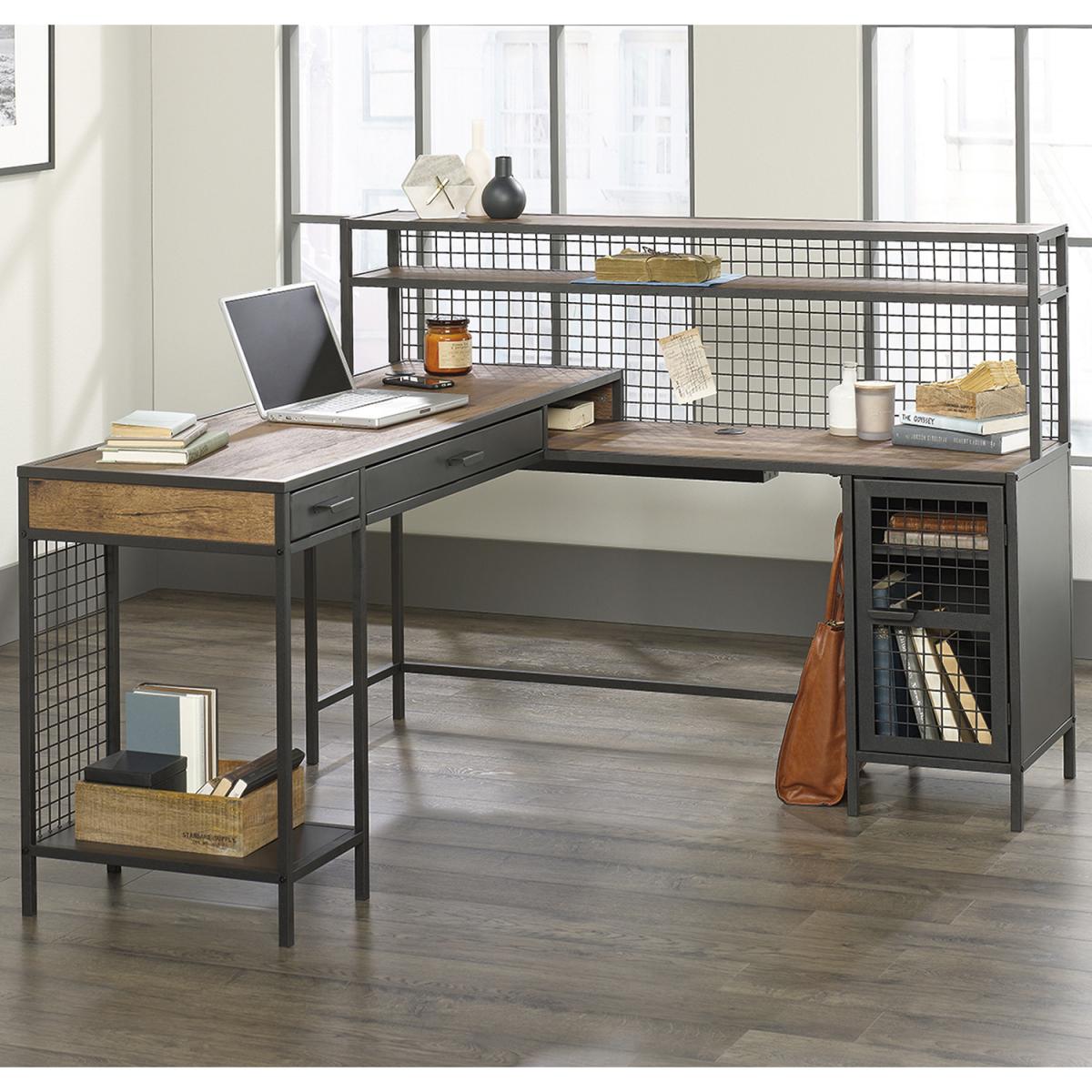 The Teknik Boulevard L-Shaped Desk is an ideal option for those that need the full office solution for their home office without taking up all the room! This fresh and modern styled desk benefits from a large desktop working surface finished in a stunning contrasting Vintage Oak Accent effect which not only provides more than ample space for writing and computer work, it is an ideal match for all decorative interiors. There are two storage drawers with full extension slides to stash all manner of desking stationery as well as an adjustable shelf discreetly hidden behind a metal door with a wire mesh front, all finished in sleek black. The elevated shelving is perfect for displaying or storing any relevant office accessories and the practical and the neat and practical mesh above the desk is ideal for clipping on reminders or creating an additional storage option space. There is also a grommet hole for discreet cable management. The look is completed with a beautifully finished powder coated metal frame, ensuring durability and life on the desk. This desk also benefits from a 360 degree finish, for effortless and versatile placement anywhere within your home or office working area. This product is full self-assembly with a large number of parts and will likely take around 3hrs to build using screwdrivers and Allen keys. Please contact the manufacturer if you need any further details