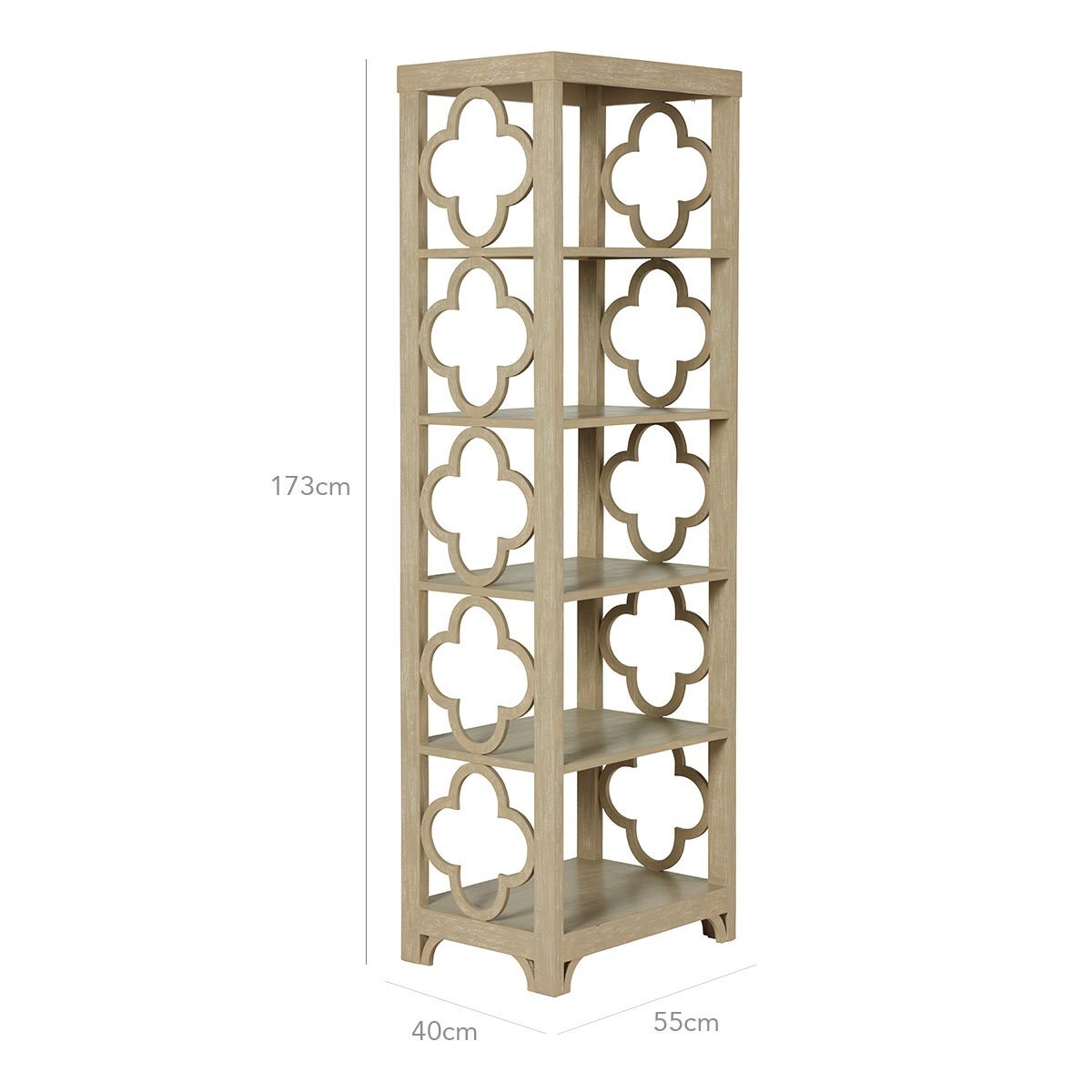 Our Bourges Bookcase's carved quatrefoil design makes it a prominent feature in a living space. While its design is inspired by Gothic-Renaissance architecture, the smart shelving unit is made modern with a pale mango-wood frame, and offers plenty of space for your best-loved novels, as well displays of flowers and photos. Despite its large size, the open frame creates a more delicate aesthetic, meaning this bookcase looks at home in any space.