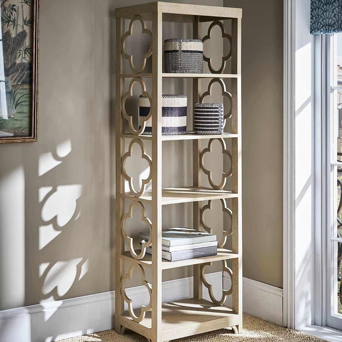 Our Bourges Bookcase's carved quatrefoil design makes it a prominent feature in a living space. While its design is inspired by Gothic-Renaissance architecture, the smart shelving unit is made modern with a pale mango-wood frame, and offers plenty of space for your best-loved novels, as well displays of flowers and photos. Despite its large size, the open frame creates a more delicate aesthetic, meaning this bookcase looks at home in any space.