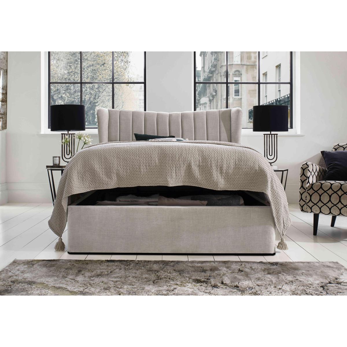 We love everything about this fabulous ottoman bed frame. It looks fabulous and that headboard is a real showstopper. And the ottoman storage space is just so roomy. Why you'll love it This luxurious ottoman bed frame will transform your bedroom. Contemporary elegance with practical storage. Showstopping tall headboard with gently curved wings. Sumptuously cushioned with sophisticated fluting. Set on dark ebony wood feet. Deep base for maximum storage capacity. Breathable slatted base promises a cooler night’s sleep. In a wide choice of upholstery fabrics. Handmade in the UK. The Highgrove Bourne ottoman bed frame is a Furniture Village exclusive. What you need to know Mattress sold separately. Wooden slat support. 28 slats in king size. Ottoman opens at the end. In small double, double, king and super king sizes. Please keep hands clear of the mechanism when opening and closing. Clean regularly using a soft brush or vacuum with the curtain attachment. Deal with any spills promptly. Professional cleaning advised for oil- and grease-based stains. Some fabrics can show wear on areas of more use or in direct sunlight. Flattening and shading of heavy wear areas on pile fabrics like velvet is unavoidable. Be sure to brush pile fabrics only in the direction of the pile. Please read our upholstery care guide for more advice.