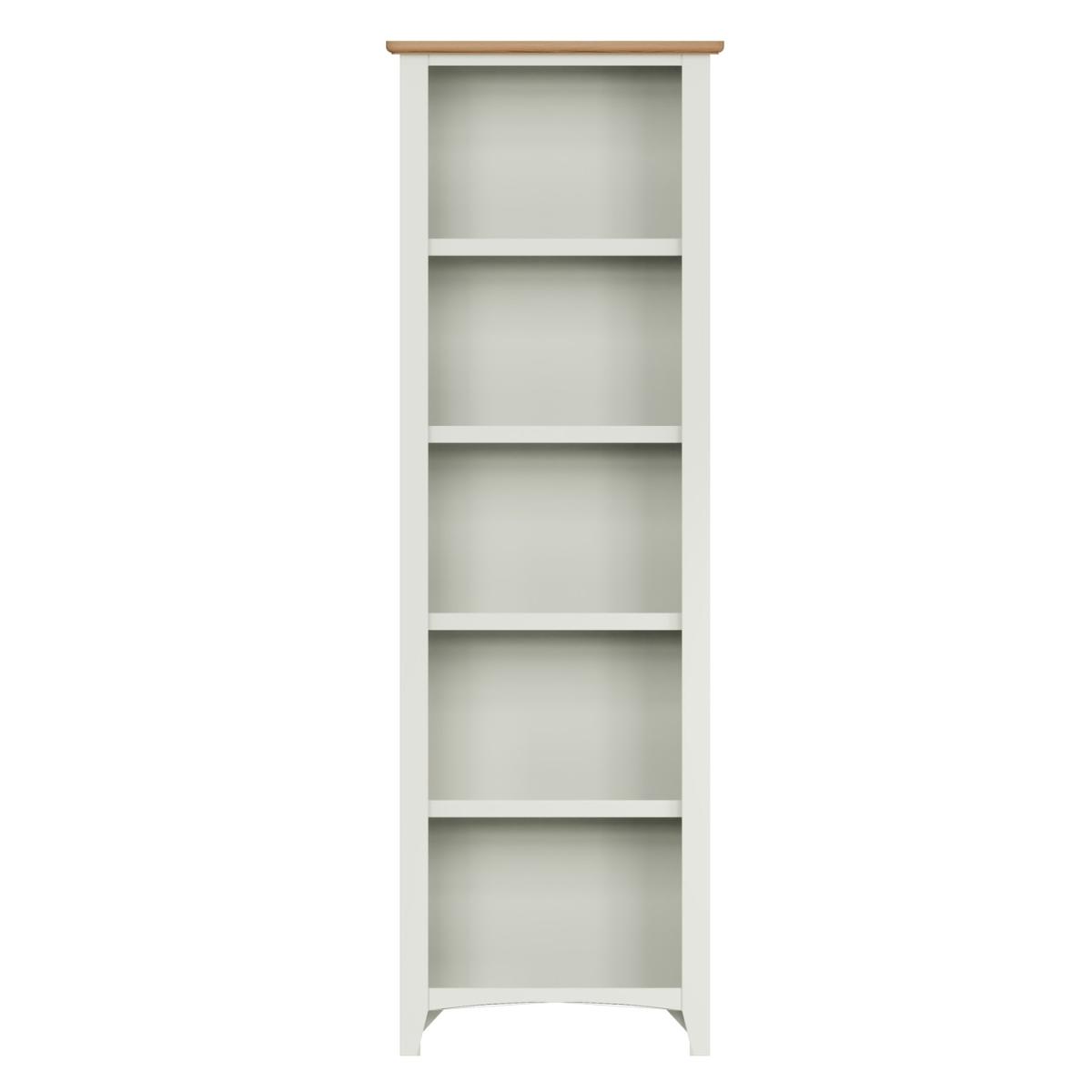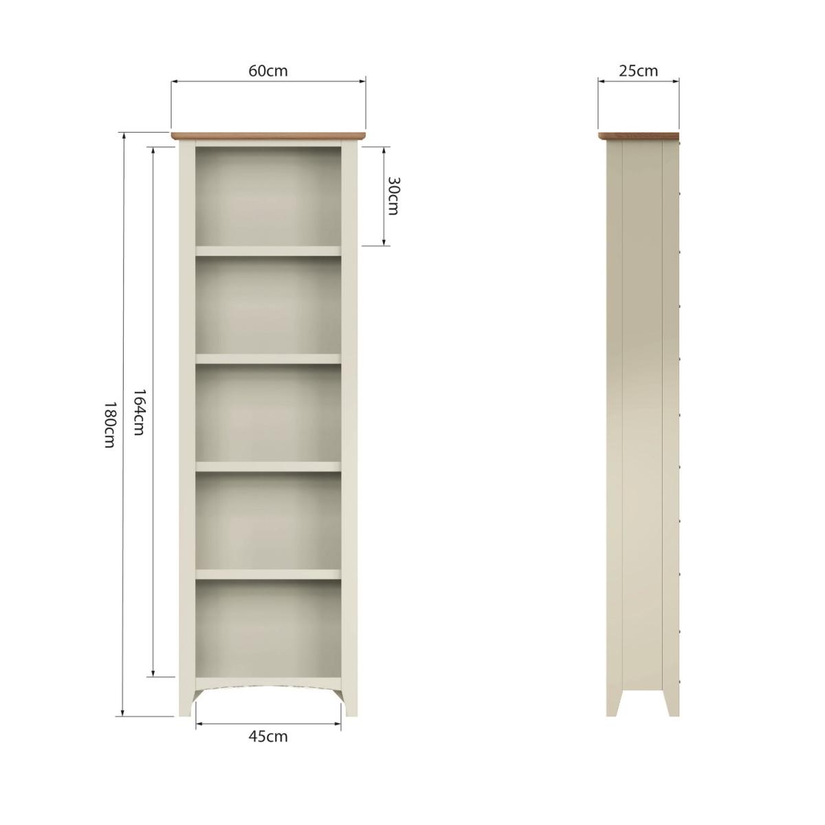 Dimensions W60x H180x D25 cm. The Bourton white and oak range combines country classic looks with a contemporary charm. Complete your living space with the Bourton large bookcase. The combination of excellent quality and classic design ensures a timeless appeal and fits perfectly alongside both traditional and contemporary decor. Features. Solid Wood Frame Stylish and practical5 spacious shelves. Round corners with bevel detailing. Tapered legs. Ready Assembled..