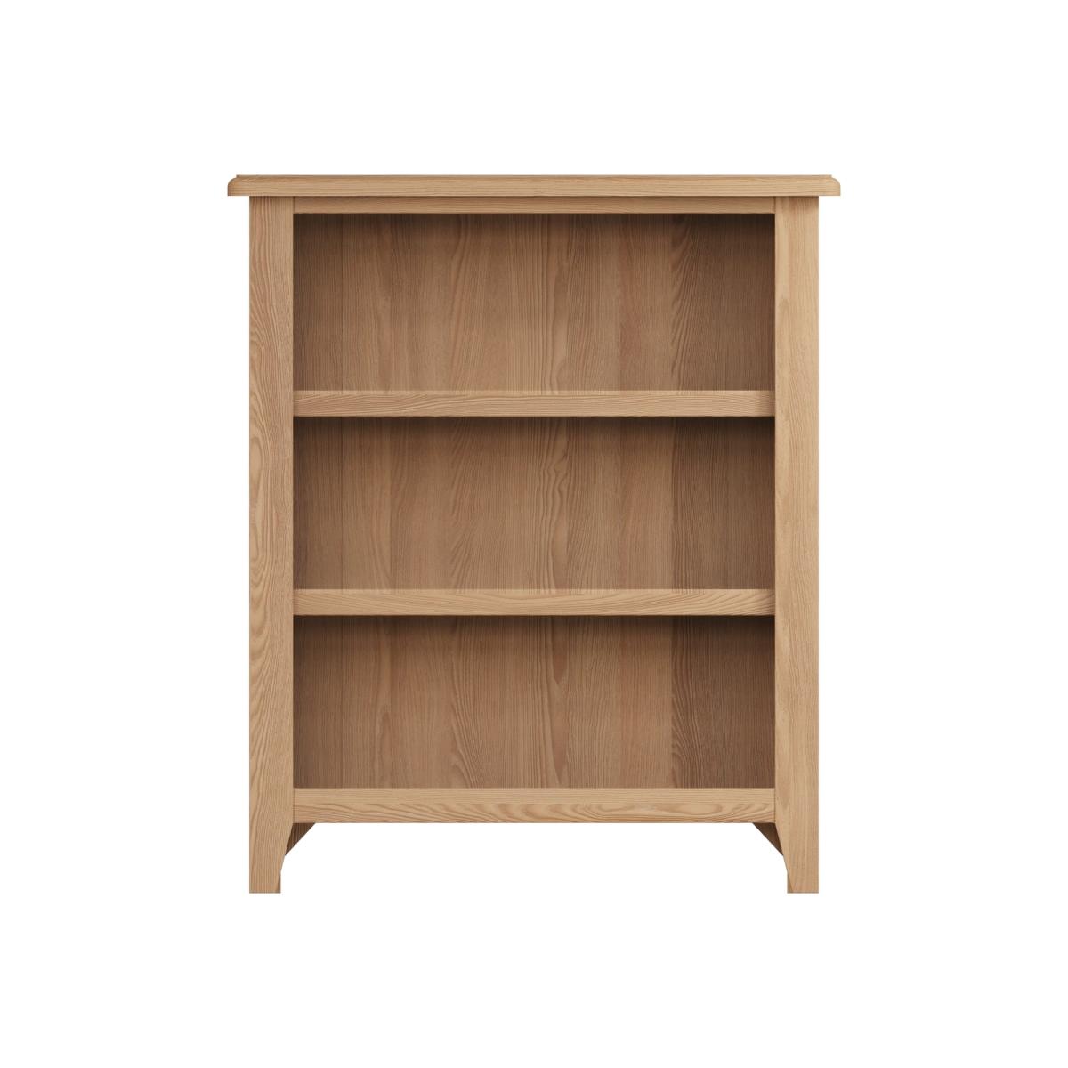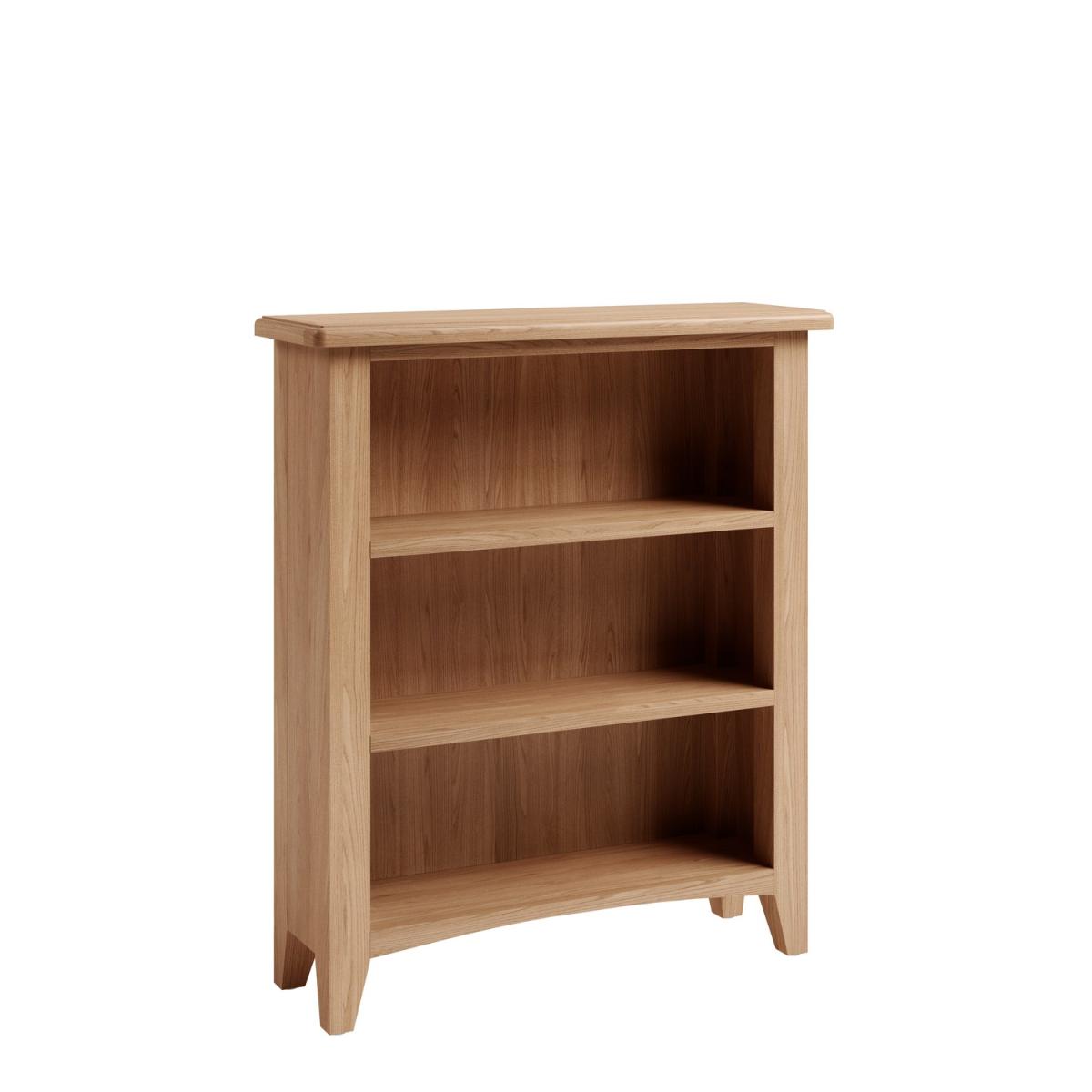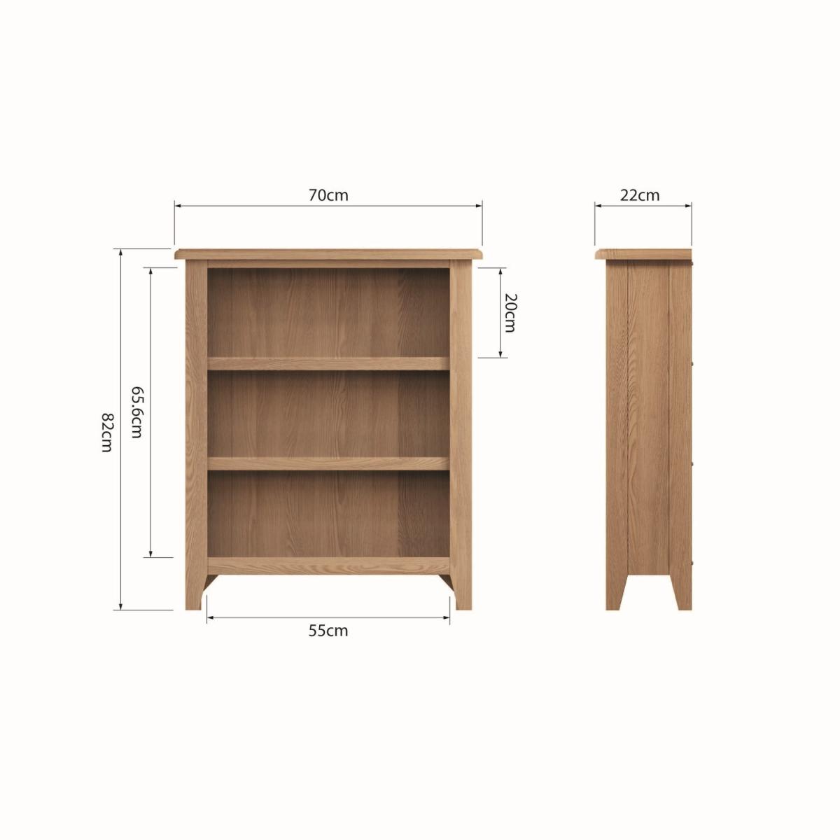 Dimensions W70 x D22 x H80 cm. Complete your living space with the Bourton low solid oak bookcase. The combination of superior quality materials and classic design ensures a timeless appeal and fits perfectly alongside both traditional and contemporary decor. Features. Solid oak frame. Round corners with bevel detailing3 shelves are provided. Tapered legs. Assembly required..