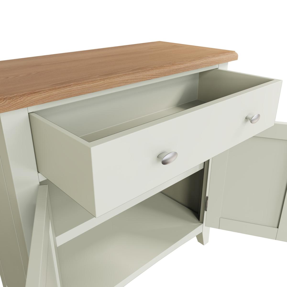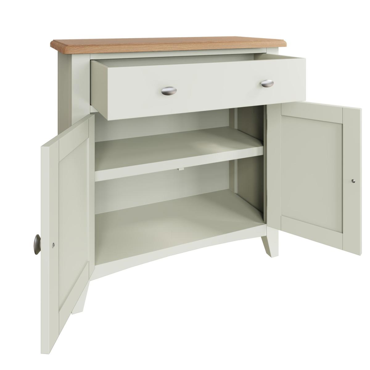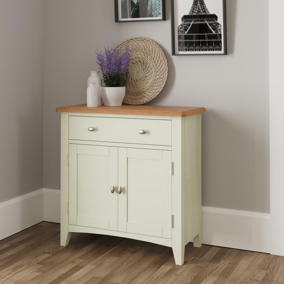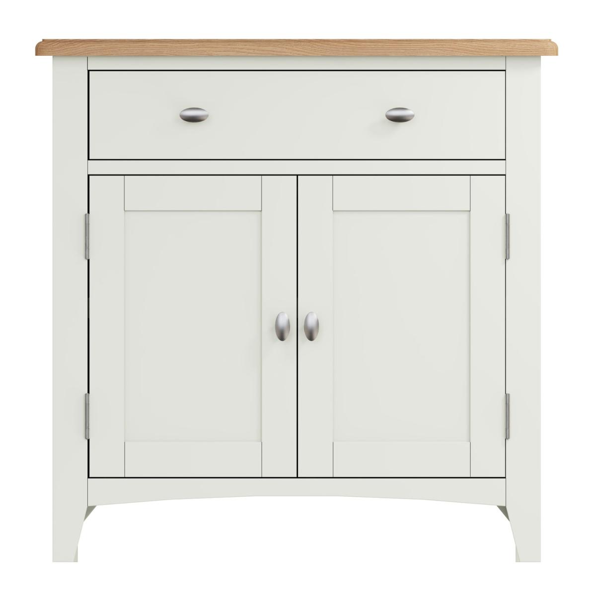 Dimensions W75x H77x D34 cm. The Bourton white and oak range combines country classic looks with a contemporary charm. This Bourton double door sideboard will make a rustic and stylish addition to your home. The generous rectangular top provides you with shelf space whilst the stylishly finished drawers and doors conceal ample storage space. Features. Solid wood frame. Internal shelf. Dovetailed drawer. Rounded corners with bevel detailing. Tapered legs. Ready Assembled..