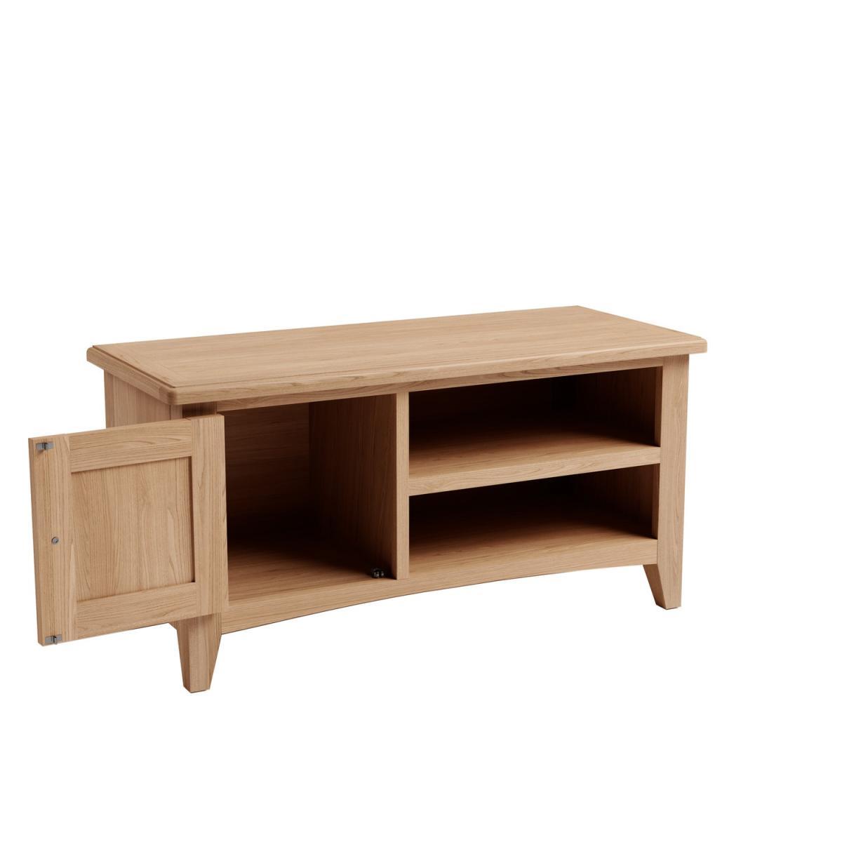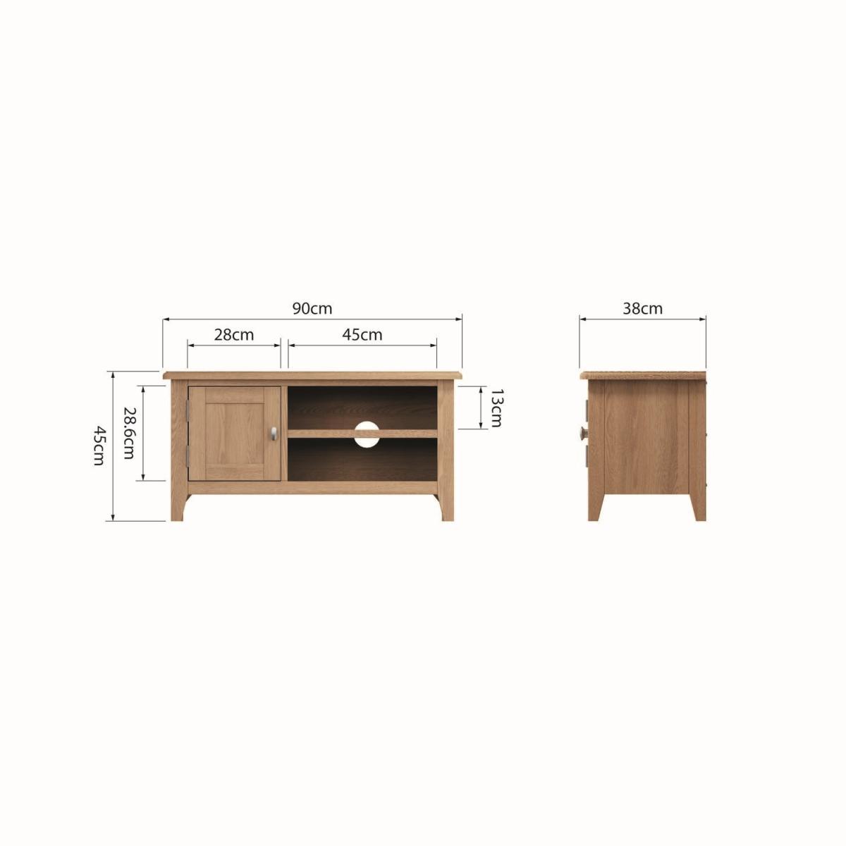 Dimensions W90 x D38 x H82 cmThe . Bourton solid oak TV unit not only looks exceptional thanks to its great quality but provides plenty of storage space too. This TV unit gives you plenty of space to stand your TV set top box DVD player and more all within really easy reach. Features. Solid oak frame2 open shelves for media players Cable holes in back of unit. Rounded corners with bevel detailing and tapered legs. Assembly required..