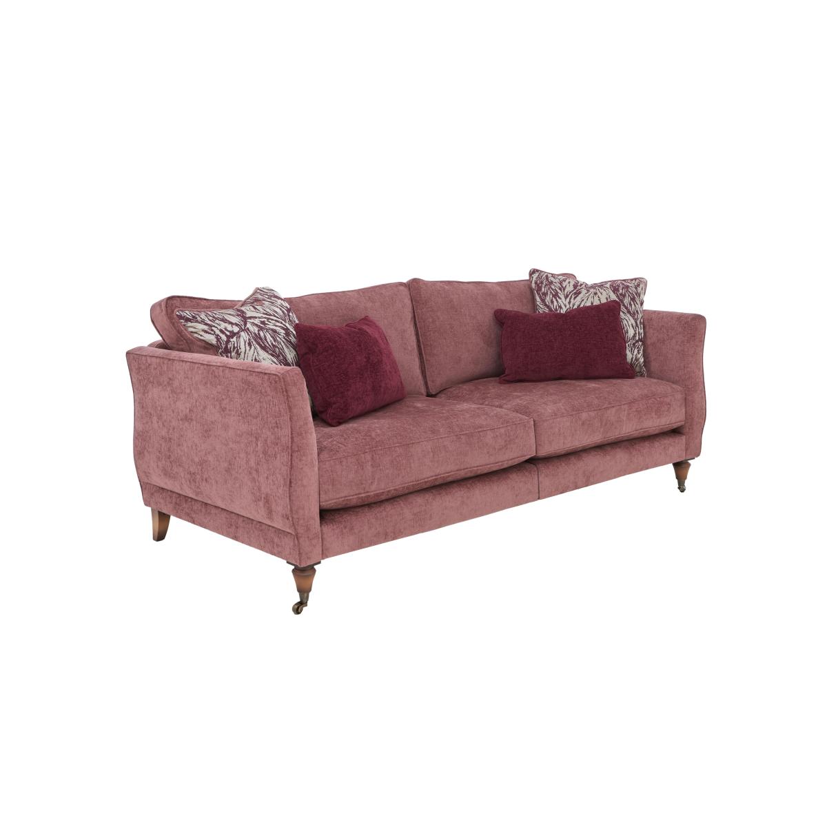 A new age of elegance has arrived. The handcrafted Boutique Chatterley range, part of our Boutique Collection, displays grace and grandeur at every turn, drawing inspiration from traditional British sofa style. You’ll find charming drop down Knole arms secured by wooden finials and silken cords with tassels, slender curved arms, scroll backs and turned wood legs. You’ll also enjoy the way this range embraces modern comfort in its generous proportions, sprung seats, sumptuous sink-in cushioning, and complimentary feather-filled scatters and bolsters. Pieces are available in a choice of hand-picked fabrics and carefully edited colour palettes. The Boutique Chatterley range is exclusively available at Furniture Village. This beautiful handmade sofa combines traditional style with modern comfort – sprung seats and feather cushioning – and convenience. Its split frame makes it easy to bring home. Why you'll love it Classic curves meet superb comfort in this 4-seater split frame fabric sofa. Traditional British elegance, extraordinary attention to detail. Upholstered by hand in a collection of exceptional fabrics and beautiful colourways. Choose Bolero, a soft, vintage-look chenille, or Canopy, a satin with a woven leaf pattern. The generous sprung seats have feather and fibre cushioning for sink-in softness. With 2 feather scatter cushions and 2 feather bolster cushions. Choice of turned wood leg colour with optional castors. Sturdy frame is built by hand and comes with a 10-year guarantee. Exclusive to Furniture Village. This 4-seater split frame sofa is part of the Boutique Chatterley range. What you need to know Medium comfort level. Seat suspension: zig-zag springs. Seat cushioning: fibre and feather. Seat cushions are reversible. Back support: elasticated webbing. Back cushioning: fibre and feather. Back cushions are reversible. If you choose a Bolero fabric, the bolster cushions will be in the same fabric. The scatter cushions will have coordinating Canopy fabric fronts, and Bolero fabric backs and piping. If you choose a Canopy fabric, the bolster cushions will be in a coordinating Bolero fabric. The scatter cushions will have Canopy fabric fronts, and coordinating Bolero fabric backs and piping. Allergies? This sofa and its scatter and bolster cushions can be made with fibre filling. This large sofa has a split frame for easier access. Feet are removable. Plump sofa cushions daily to maintain fullness. Some fabrics can show wear on areas of more use or in direct sunlight. Clean regularly using a soft brush or vacuum with the curtain attachment. Deal with any spills promptly. Professional cleaning advised for oil- and grease-based stains. Please read our upholstery care guide for more advice.