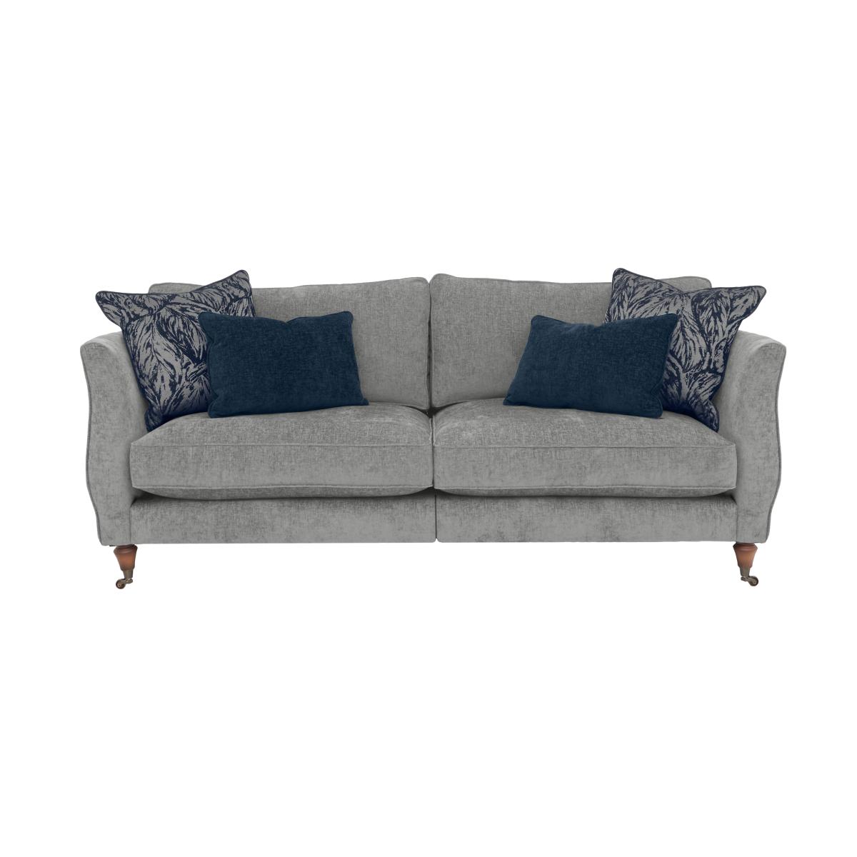 A new age of elegance has arrived. The handcrafted Boutique Chatterley range, part of our Boutique Collection, displays grace and grandeur at every turn, drawing inspiration from traditional British sofa style. You’ll find charming drop down Knole arms secured by wooden finials and silken cords with tassels, slender curved arms, scroll backs and turned wood legs. You’ll also enjoy the way this range embraces modern comfort in its generous proportions, sprung seats, sumptuous sink-in cushioning, and complimentary feather-filled scatters and bolsters. Pieces are available in a choice of hand-picked fabrics and carefully edited colour palettes. The Boutique Chatterley range is exclusively available at Furniture Village. This beautiful handmade sofa combines traditional style with modern comfort – sprung seats and feather cushioning – and convenience. Its split frame makes it easy to bring home. Why you'll love it Classic curves meet superb comfort in this 4-seater split frame fabric sofa. Traditional British elegance, extraordinary attention to detail. Upholstered by hand in a collection of exceptional fabrics and beautiful colourways. Choose Bolero, a soft, vintage-look chenille, or Canopy, a satin with a woven leaf pattern. The generous sprung seats have feather and fibre cushioning for sink-in softness. With 2 feather scatter cushions and 2 feather bolster cushions. Choice of turned wood leg colour with optional castors. Sturdy frame is built by hand and comes with a 10-year guarantee. Exclusive to Furniture Village. This 4-seater split frame sofa is part of the Boutique Chatterley range. What you need to know Medium comfort level. Seat suspension: zig-zag springs. Seat cushioning: fibre and feather. Seat cushions are reversible. Back support: elasticated webbing. Back cushioning: fibre and feather. Back cushions are reversible. If you choose a Bolero fabric, the bolster cushions will be in the same fabric. The scatter cushions will have coordinating Canopy fabric fronts, and Bolero fabric backs and piping. If you choose a Canopy fabric, the bolster cushions will be in a coordinating Bolero fabric. The scatter cushions will have Canopy fabric fronts, and coordinating Bolero fabric backs and piping. Allergies? This sofa and its scatter and bolster cushions can be made with fibre filling. This large sofa has a split frame for easier access. Feet are removable. Plump sofa cushions daily to maintain fullness. Some fabrics can show wear on areas of more use or in direct sunlight. Clean regularly using a soft brush or vacuum with the curtain attachment. Deal with any spills promptly. Professional cleaning advised for oil- and grease-based stains. Please read our upholstery care guide for more advice.