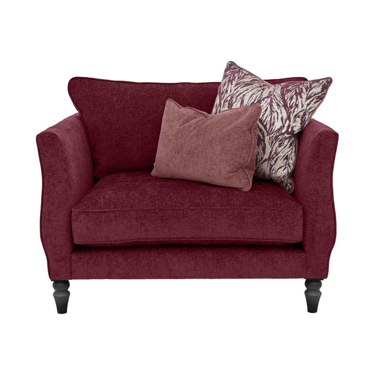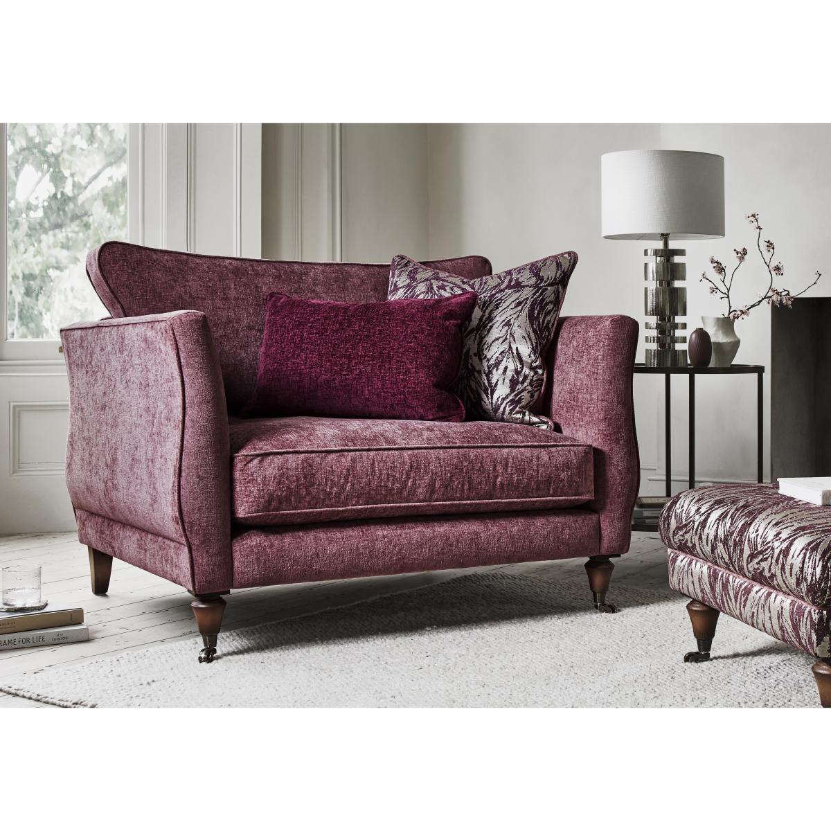 A new age of elegance has arrived. The handcrafted Boutique Chatterley range, part of our Boutique Collection, displays grace and grandeur at every turn, drawing inspiration from traditional British sofa style. You’ll find charming drop down Knole arms secured by wooden finials and silken cords with tassels, slender curved arms, scroll backs and turned wood legs. You’ll also enjoy the way this range embraces modern comfort in its generous proportions, sprung seats, sumptuous sink-in cushioning, and complimentary feather-filled scatters and bolsters. Pieces are available in a choice of hand-picked fabrics and carefully edited colour palettes. The Boutique Chatterley range is exclusively available at Furniture Village. There’s room for you and a friend to enjoy elegant style and sumptuous comfort thanks to this beautifully handcrafted snuggler chair. Only at Furniture Village. Why you'll love it Make yourself at home on this roomy and inviting snuggler chair. Traditional British elegance, extraordinary attention to detail. Upholstered by hand in a collection of exceptional fabrics and beautiful colourways. Choose Bolero, a soft, vintage-look chenille, or Canopy, a satin with a woven leaf pattern. The generous sprung seat has feather and fibre cushioning for sink-in softness. With a feather scatter cushion and a feather bolster cushion. Choice of turned wood leg colour with optional castors. Sturdy frame is built by hand and comes with a 10-year guarantee. Exclusive to Furniture Village. This snuggler is part of the Boutique Chatterley range. What you need to know Medium comfort level. Seat suspension: zig-zag springs. Seat cushioning: fibre and feather. Seat cushion is reversible. Back support: elasticated webbing. Back cushioning: fibre and feather. Back cushion is reversible. If you choose a Bolero fabric, the bolster cushion will be in the same fabric. The scatter cushion will have coordinating Canopy fabric fronts, and Bolero fabric backs and piping. If you choose a Canopy fabric, the bolster cushion will be in a coordinating Bolero fabric. The scatter cushion will have Canopy fabric fronts, and coordinating Bolero fabric backs and piping. Allergies? This snuggler and its scatter and bolster cushions can be made with fibre filling. Feet are removable. Plump snuggler cushions daily to maintain fullness. Some fabrics can show wear on areas of more use or in direct sunlight. Clean regularly using a soft brush or vacuum with the curtain attachment. Deal with any spills promptly. Professional cleaning advised for oil- and grease-based stains. Please read our upholstery care guide for more advice.