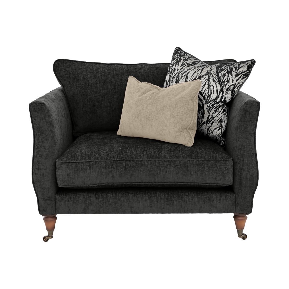 A new age of elegance has arrived. The handcrafted Boutique Chatterley range, part of our Boutique Collection, displays grace and grandeur at every turn, drawing inspiration from traditional British sofa style. You’ll find charming drop down Knole arms secured by wooden finials and silken cords with tassels, slender curved arms, scroll backs and turned wood legs. You’ll also enjoy the way this range embraces modern comfort in its generous proportions, sprung seats, sumptuous sink-in cushioning, and complimentary feather-filled scatters and bolsters. Pieces are available in a choice of hand-picked fabrics and carefully edited colour palettes. The Boutique Chatterley range is exclusively available at Furniture Village. There’s room for you and a friend to enjoy elegant style and sumptuous comfort thanks to this beautifully handcrafted snuggler chair. Only at Furniture Village. Why you'll love it Make yourself at home on this roomy and inviting snuggler chair. Traditional British elegance, extraordinary attention to detail. Upholstered by hand in a collection of exceptional fabrics and beautiful colourways. Choose Bolero, a soft, vintage-look chenille, or Canopy, a satin with a woven leaf pattern. The generous sprung seat has feather and fibre cushioning for sink-in softness. With a feather scatter cushion and a feather bolster cushion. Choice of turned wood leg colour with optional castors. Sturdy frame is built by hand and comes with a 10-year guarantee. Exclusive to Furniture Village. This snuggler is part of the Boutique Chatterley range. What you need to know Medium comfort level. Seat suspension: zig-zag springs. Seat cushioning: fibre and feather. Seat cushion is reversible. Back support: elasticated webbing. Back cushioning: fibre and feather. Back cushion is reversible. If you choose a Bolero fabric, the bolster cushion will be in the same fabric. The scatter cushion will have coordinating Canopy fabric fronts, and Bolero fabric backs and piping. If you choose a Canopy fabric, the bolster cushion will be in a coordinating Bolero fabric. The scatter cushion will have Canopy fabric fronts, and coordinating Bolero fabric backs and piping. Allergies? This snuggler and its scatter and bolster cushions can be made with fibre filling. Feet are removable. Plump snuggler cushions daily to maintain fullness. Some fabrics can show wear on areas of more use or in direct sunlight. Clean regularly using a soft brush or vacuum with the curtain attachment. Deal with any spills promptly. Professional cleaning advised for oil- and grease-based stains. Please read our upholstery care guide for more advice.