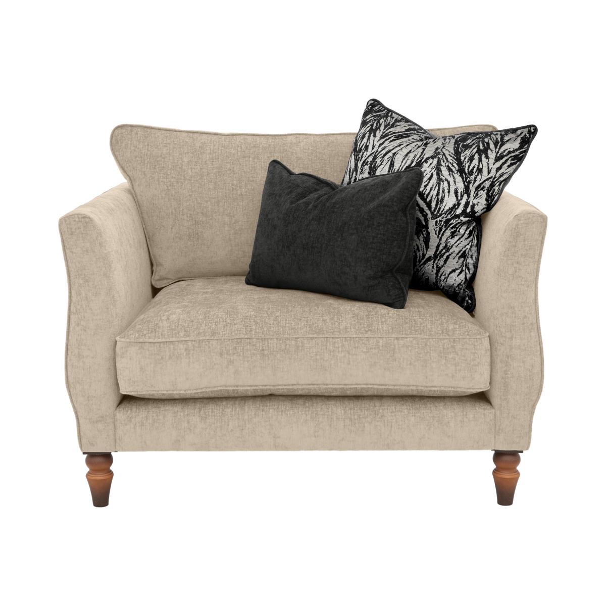 A new age of elegance has arrived. The handcrafted Boutique Chatterley range, part of our Boutique Collection, displays grace and grandeur at every turn, drawing inspiration from traditional British sofa style. You’ll find charming drop down Knole arms secured by wooden finials and silken cords with tassels, slender curved arms, scroll backs and turned wood legs. You’ll also enjoy the way this range embraces modern comfort in its generous proportions, sprung seats, sumptuous sink-in cushioning, and complimentary feather-filled scatters and bolsters. Pieces are available in a choice of hand-picked fabrics and carefully edited colour palettes. The Boutique Chatterley range is exclusively available at Furniture Village. There’s room for you and a friend to enjoy elegant style and sumptuous comfort thanks to this beautifully handcrafted snuggler chair. Only at Furniture Village. Why you'll love it Make yourself at home on this roomy and inviting snuggler chair. Traditional British elegance, extraordinary attention to detail. Upholstered by hand in a collection of exceptional fabrics and beautiful colourways. Choose Bolero, a soft, vintage-look chenille, or Canopy, a satin with a woven leaf pattern. The generous sprung seat has feather and fibre cushioning for sink-in softness. With a feather scatter cushion and a feather bolster cushion. Choice of turned wood leg colour with optional castors. Sturdy frame is built by hand and comes with a 10-year guarantee. Exclusive to Furniture Village. This snuggler is part of the Boutique Chatterley range. What you need to know Medium comfort level. Seat suspension: zig-zag springs. Seat cushioning: fibre and feather. Seat cushion is reversible. Back support: elasticated webbing. Back cushioning: fibre and feather. Back cushion is reversible. If you choose a Bolero fabric, the bolster cushion will be in the same fabric. The scatter cushion will have coordinating Canopy fabric fronts, and Bolero fabric backs and piping. If you choose a Canopy fabric, the bolster cushion will be in a coordinating Bolero fabric. The scatter cushion will have Canopy fabric fronts, and coordinating Bolero fabric backs and piping. Allergies? This snuggler and its scatter and bolster cushions can be made with fibre filling. Feet are removable. Plump snuggler cushions daily to maintain fullness. Some fabrics can show wear on areas of more use or in direct sunlight. Clean regularly using a soft brush or vacuum with the curtain attachment. Deal with any spills promptly. Professional cleaning advised for oil- and grease-based stains. Please read our upholstery care guide for more advice.