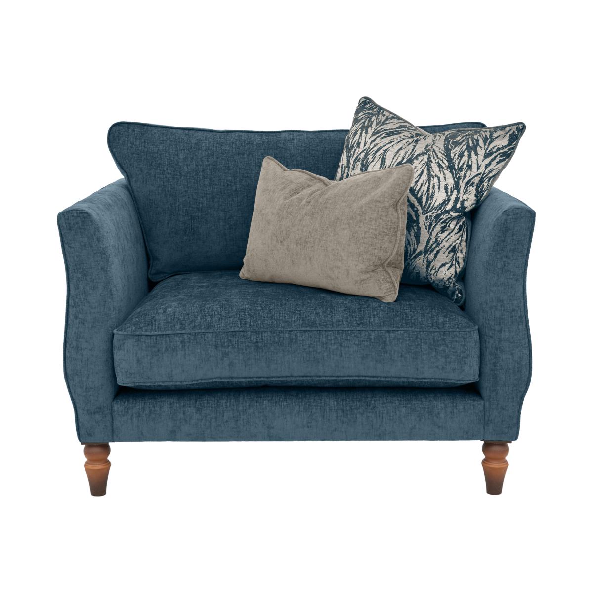A new age of elegance has arrived. The handcrafted Boutique Chatterley range, part of our Boutique Collection, displays grace and grandeur at every turn, drawing inspiration from traditional British sofa style. You’ll find charming drop down Knole arms secured by wooden finials and silken cords with tassels, slender curved arms, scroll backs and turned wood legs. You’ll also enjoy the way this range embraces modern comfort in its generous proportions, sprung seats, sumptuous sink-in cushioning, and complimentary feather-filled scatters and bolsters. Pieces are available in a choice of hand-picked fabrics and carefully edited colour palettes. The Boutique Chatterley range is exclusively available at Furniture Village. There’s room for you and a friend to enjoy elegant style and sumptuous comfort thanks to this beautifully handcrafted snuggler chair. Only at Furniture Village. Why you'll love it Make yourself at home on this roomy and inviting snuggler chair. Traditional British elegance, extraordinary attention to detail. Upholstered by hand in a collection of exceptional fabrics and beautiful colourways. Choose Bolero, a soft, vintage-look chenille, or Canopy, a satin with a woven leaf pattern. The generous sprung seat has feather and fibre cushioning for sink-in softness. With a feather scatter cushion and a feather bolster cushion. Choice of turned wood leg colour with optional castors. Sturdy frame is built by hand and comes with a 10-year guarantee. Exclusive to Furniture Village. This snuggler is part of the Boutique Chatterley range. What you need to know Medium comfort level. Seat suspension: zig-zag springs. Seat cushioning: fibre and feather. Seat cushion is reversible. Back support: elasticated webbing. Back cushioning: fibre and feather. Back cushion is reversible. If you choose a Bolero fabric, the bolster cushion will be in the same fabric. The scatter cushion will have coordinating Canopy fabric fronts, and Bolero fabric backs and piping. If you choose a Canopy fabric, the bolster cushion will be in a coordinating Bolero fabric. The scatter cushion will have Canopy fabric fronts, and coordinating Bolero fabric backs and piping. Allergies? This snuggler and its scatter and bolster cushions can be made with fibre filling. Feet are removable. Plump snuggler cushions daily to maintain fullness. Some fabrics can show wear on areas of more use or in direct sunlight. Clean regularly using a soft brush or vacuum with the curtain attachment. Deal with any spills promptly. Professional cleaning advised for oil- and grease-based stains. Please read our upholstery care guide for more advice.