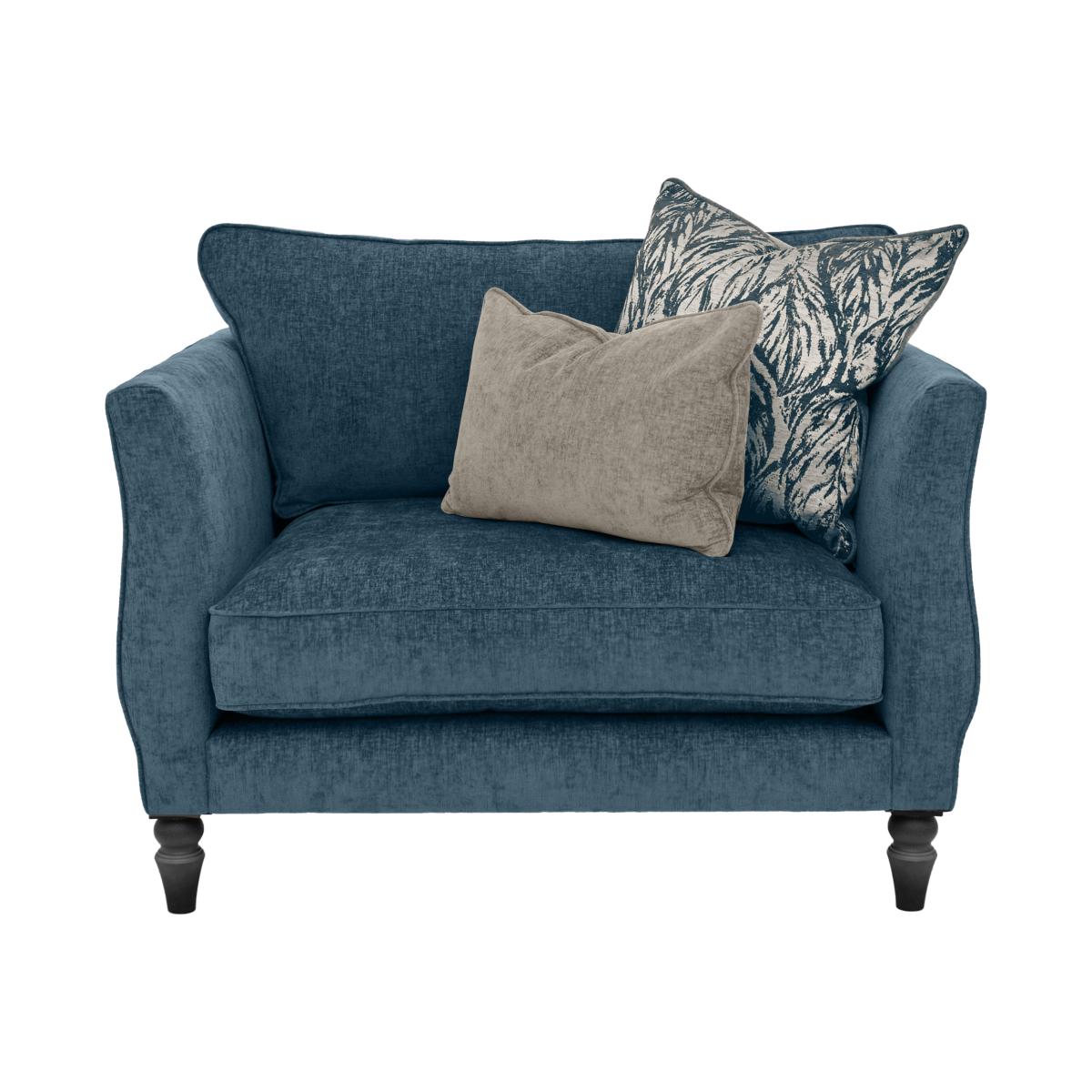 A new age of elegance has arrived. The handcrafted Boutique Chatterley range, part of our Boutique Collection, displays grace and grandeur at every turn, drawing inspiration from traditional British sofa style. You’ll find charming drop down Knole arms secured by wooden finials and silken cords with tassels, slender curved arms, scroll backs and turned wood legs. You’ll also enjoy the way this range embraces modern comfort in its generous proportions, sprung seats, sumptuous sink-in cushioning, and complimentary feather-filled scatters and bolsters. Pieces are available in a choice of hand-picked fabrics and carefully edited colour palettes. The Boutique Chatterley range is exclusively available at Furniture Village. There’s room for you and a friend to enjoy elegant style and sumptuous comfort thanks to this beautifully handcrafted snuggler chair. Only at Furniture Village. Why you'll love it Make yourself at home on this roomy and inviting snuggler chair. Traditional British elegance, extraordinary attention to detail. Upholstered by hand in a collection of exceptional fabrics and beautiful colourways. Choose Bolero, a soft, vintage-look chenille, or Canopy, a satin with a woven leaf pattern. The generous sprung seat has feather and fibre cushioning for sink-in softness. With a feather scatter cushion and a feather bolster cushion. Choice of turned wood leg colour with optional castors. Sturdy frame is built by hand and comes with a 10-year guarantee. Exclusive to Furniture Village. This snuggler is part of the Boutique Chatterley range. What you need to know Medium comfort level. Seat suspension: zig-zag springs. Seat cushioning: fibre and feather. Seat cushion is reversible. Back support: elasticated webbing. Back cushioning: fibre and feather. Back cushion is reversible. If you choose a Bolero fabric, the bolster cushion will be in the same fabric. The scatter cushion will have coordinating Canopy fabric fronts, and Bolero fabric backs and piping. If you choose a Canopy fabric, the bolster cushion will be in a coordinating Bolero fabric. The scatter cushion will have Canopy fabric fronts, and coordinating Bolero fabric backs and piping. Allergies? This snuggler and its scatter and bolster cushions can be made with fibre filling. Feet are removable. Plump snuggler cushions daily to maintain fullness. Some fabrics can show wear on areas of more use or in direct sunlight. Clean regularly using a soft brush or vacuum with the curtain attachment. Deal with any spills promptly. Professional cleaning advised for oil- and grease-based stains. Please read our upholstery care guide for more advice.