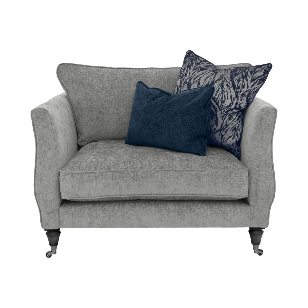 A new age of elegance has arrived. The handcrafted Boutique Chatterley range, part of our Boutique Collection, displays grace and grandeur at every turn, drawing inspiration from traditional British sofa style. You’ll find charming drop down Knole arms secured by wooden finials and silken cords with tassels, slender curved arms, scroll backs and turned wood legs. You’ll also enjoy the way this range embraces modern comfort in its generous proportions, sprung seats, sumptuous sink-in cushioning, and complimentary feather-filled scatters and bolsters. Pieces are available in a choice of hand-picked fabrics and carefully edited colour palettes. The Boutique Chatterley range is exclusively available at Furniture Village. There’s room for you and a friend to enjoy elegant style and sumptuous comfort thanks to this beautifully handcrafted snuggler chair. Only at Furniture Village. Why you'll love it Make yourself at home on this roomy and inviting snuggler chair. Traditional British elegance, extraordinary attention to detail. Upholstered by hand in a collection of exceptional fabrics and beautiful colourways. Choose Bolero, a soft, vintage-look chenille, or Canopy, a satin with a woven leaf pattern. The generous sprung seat has feather and fibre cushioning for sink-in softness. With a feather scatter cushion and a feather bolster cushion. Choice of turned wood leg colour with optional castors. Sturdy frame is built by hand and comes with a 10-year guarantee. Exclusive to Furniture Village. This snuggler is part of the Boutique Chatterley range. What you need to know Medium comfort level. Seat suspension: zig-zag springs. Seat cushioning: fibre and feather. Seat cushion is reversible. Back support: elasticated webbing. Back cushioning: fibre and feather. Back cushion is reversible. If you choose a Bolero fabric, the bolster cushion will be in the same fabric. The scatter cushion will have coordinating Canopy fabric fronts, and Bolero fabric backs and piping. If you choose a Canopy fabric, the bolster cushion will be in a coordinating Bolero fabric. The scatter cushion will have Canopy fabric fronts, and coordinating Bolero fabric backs and piping. Allergies? This snuggler and its scatter and bolster cushions can be made with fibre filling. Feet are removable. Plump snuggler cushions daily to maintain fullness. Some fabrics can show wear on areas of more use or in direct sunlight. Clean regularly using a soft brush or vacuum with the curtain attachment. Deal with any spills promptly. Professional cleaning advised for oil- and grease-based stains. Please read our upholstery care guide for more advice.