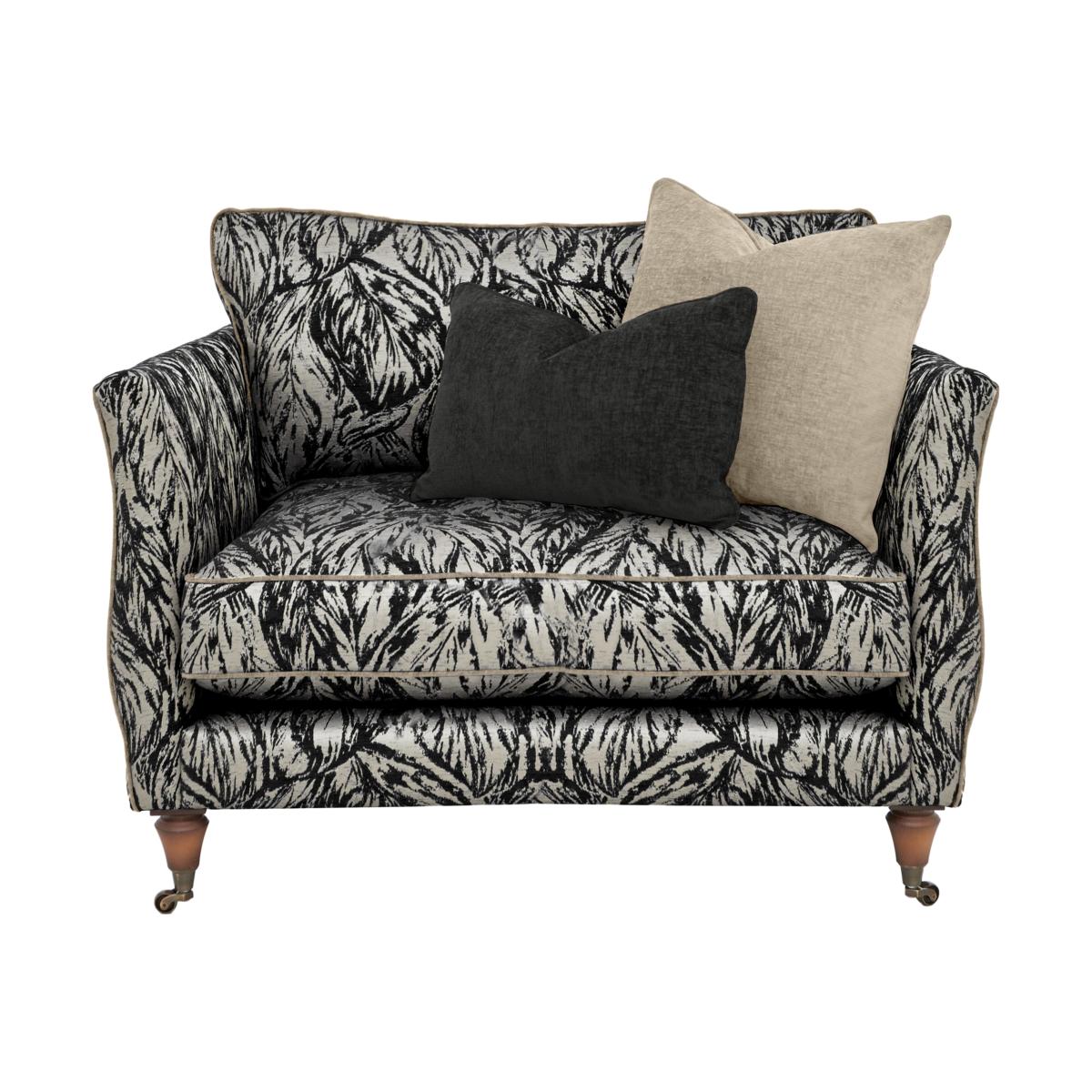 A new age of elegance has arrived. The handcrafted Boutique Chatterley range, part of our Boutique Collection, displays grace and grandeur at every turn, drawing inspiration from traditional British sofa style. You’ll find charming drop down Knole arms secured by wooden finials and silken cords with tassels, slender curved arms, scroll backs and turned wood legs. You’ll also enjoy the way this range embraces modern comfort in its generous proportions, sprung seats, sumptuous sink-in cushioning, and complimentary feather-filled scatters and bolsters. Pieces are available in a choice of hand-picked fabrics and carefully edited colour palettes. The Boutique Chatterley range is exclusively available at Furniture Village. There’s room for you and a friend to enjoy elegant style and sumptuous comfort thanks to this beautifully handcrafted snuggler chair. Only at Furniture Village. Why you'll love it Make yourself at home on this roomy and inviting snuggler chair. Traditional British elegance, extraordinary attention to detail. Upholstered by hand in a collection of exceptional fabrics and beautiful colourways. Choose Bolero, a soft, vintage-look chenille, or Canopy, a satin with a woven leaf pattern. The generous sprung seat has feather and fibre cushioning for sink-in softness. With a feather scatter cushion and a feather bolster cushion. Choice of turned wood leg colour with optional castors. Sturdy frame is built by hand and comes with a 10-year guarantee. Exclusive to Furniture Village. This snuggler is part of the Boutique Chatterley range. What you need to know Medium comfort level. Seat suspension: zig-zag springs. Seat cushioning: fibre and feather. Seat cushion is reversible. Back support: elasticated webbing. Back cushioning: fibre and feather. Back cushion is reversible. If you choose a Bolero fabric, the bolster cushion will be in the same fabric. The scatter cushion will have coordinating Canopy fabric fronts, and Bolero fabric backs and piping. If you choose a Canopy fabric, the bolster cushion will be in a coordinating Bolero fabric. The scatter cushion will have Canopy fabric fronts, and coordinating Bolero fabric backs and piping. Allergies? This snuggler and its scatter and bolster cushions can be made with fibre filling. Feet are removable. Plump snuggler cushions daily to maintain fullness. Some fabrics can show wear on areas of more use or in direct sunlight. Clean regularly using a soft brush or vacuum with the curtain attachment. Deal with any spills promptly. Professional cleaning advised for oil- and grease-based stains. Please read our upholstery care guide for more advice.