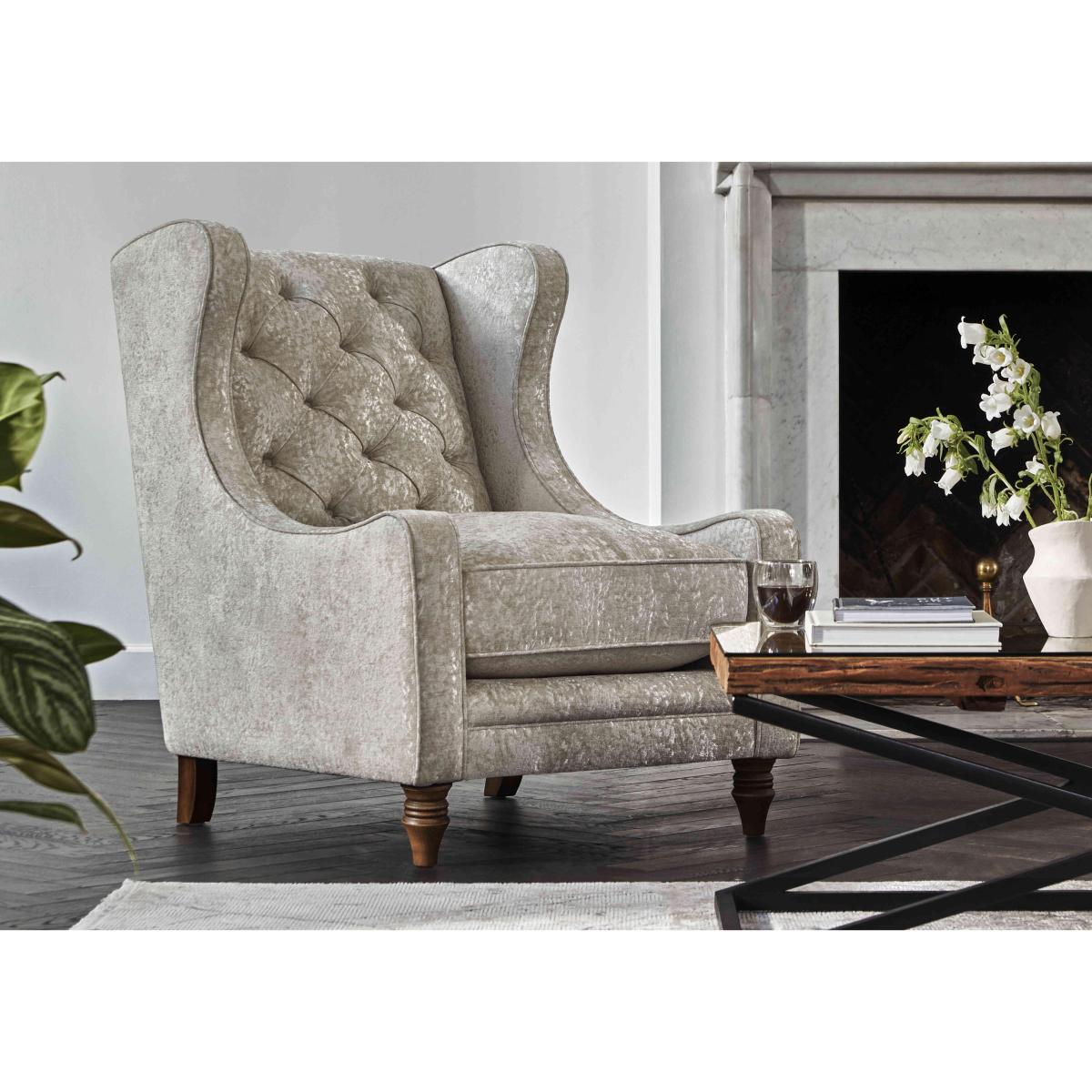 Our Boutique Blenheim collection of upholstered living room furniture is every bit as grand and gracious as the quintessentially English stately home for which it is named. You’ll find a surprising yet very gratifying combination of traditional sofa luxury – sweeping rolled arms, meticulous buttoning and turned wood legs – and contemporary sofa comfort with soft yet supportive cushioning underpinned by our five-year plumpness guarantee. This extensive range features modern feather-filled scatter back sofas, classic back sofas, armchairs and footstools in a choice of beautiful upholstery fabrics. The Boutique Blenheim collection is handcrafted in England and is exclusive to Furniture Village. The wing chair gets a glam update in our Boutique Blenheim range. The traditional details – winged sides and turned legs – are all in place along with an extra-comfy seat and supportive back. Why you'll love it Gorgeous winged chair is tradition made modern. Stately home glamour, contemporary comfort. Incredible seat cushioning with Encore foam for softness with support. Our 5-year plumpness guarantee promises that perfect sit, time after time. Superb traditional details – winged sides and turned wood legs. Choice of beautiful upholstery fabrics. Part of the Boutique Collection of timelessly elegant sofas and chairs. Handcrafted in England and exclusive to Furniture Village. This wing chair is part of the Boutique Blenheim range. What you need to know Medium comfort level. Seat suspension: zig zag springs. Seat cushioning: Encore foam. Seat cushion is reversible. Back suspension: elasticated webbing. Back cushioning: foam. Feet are removable. Some fabrics can show wear on areas of more use or in direct sunlight. Flattening and shading of heavy wear areas on pile fabrics is unavoidable. Clean regularly using a soft brush or vacuum with the curtain attachment. Deal with any spills promptly. Professional cleaning advised for oil- and grease-based stains. Please read our upholstery care guide for more advice.
