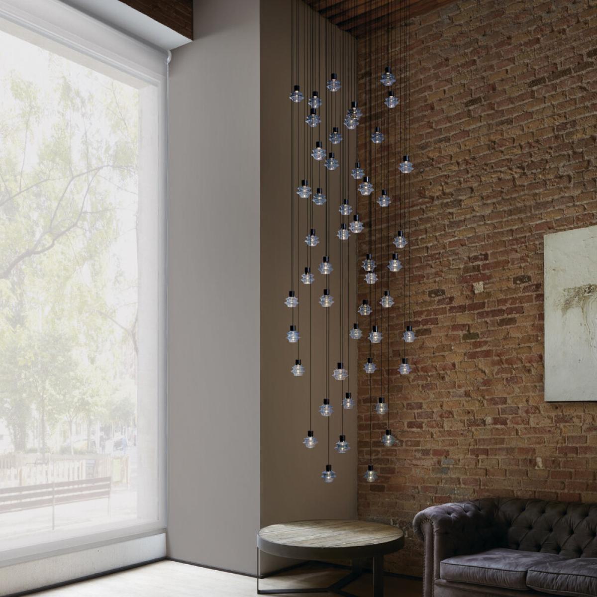 Ramp up the drama in your home with this Drop 48 light from Bover. With 48 individual LED bulbs each topped with a glass shade, this light is striking in any space. Finished with adjustable black cables to fit your ceiling height and a matching ceiling rose, it will instantly bring statement style to your interior. Key features: * Material: aluminium, iron, glass * Dimensions: H96-371xØ105cm * CE certified * Bulb requirements: 48 x integrated LEDs (included) * Colour temperature: 2700. K (warm white) * Dramatic multi bulb drop design * Each with a blue glass shade * Sleek black cables & ceiling rose * Dimmable * Adjustable height to suit your space