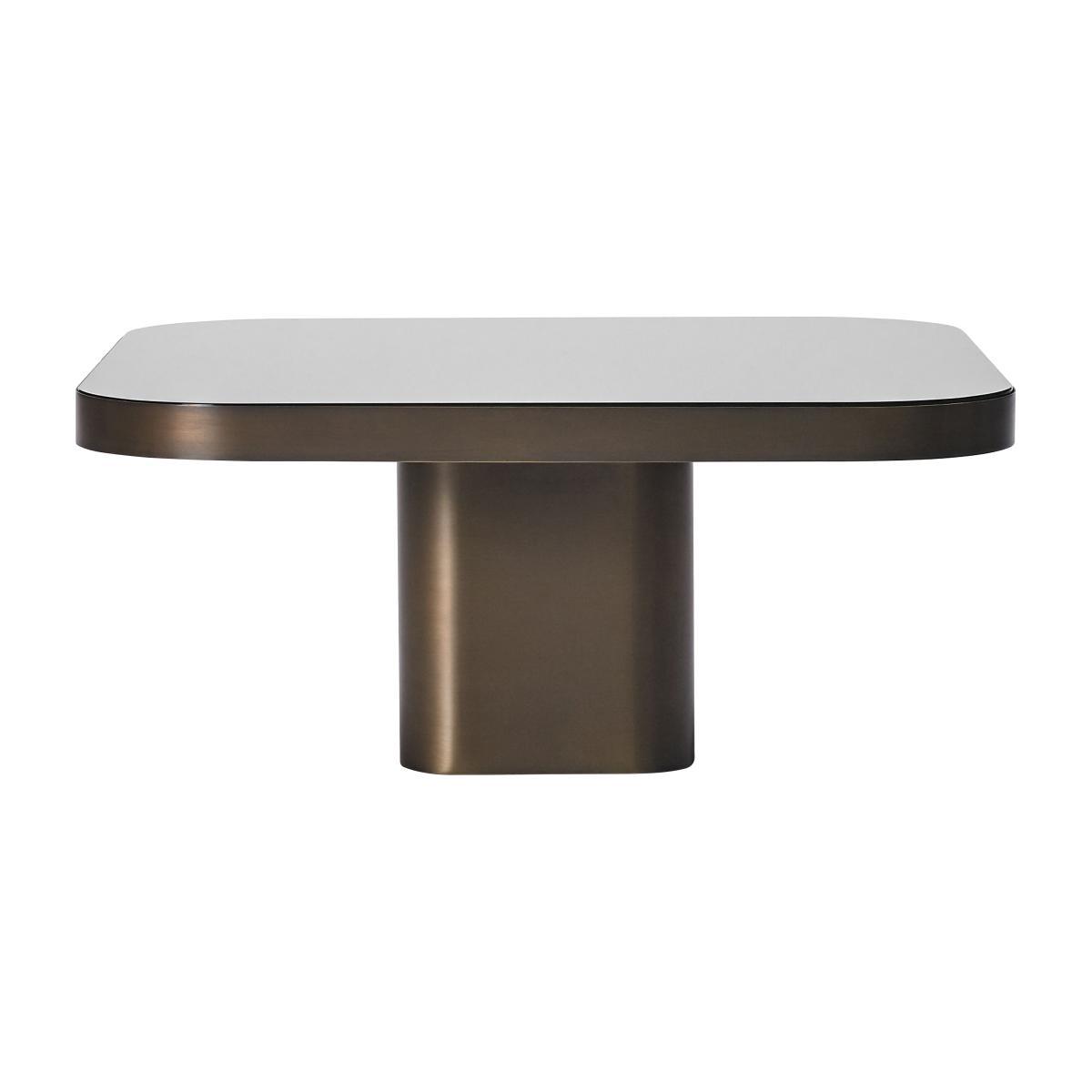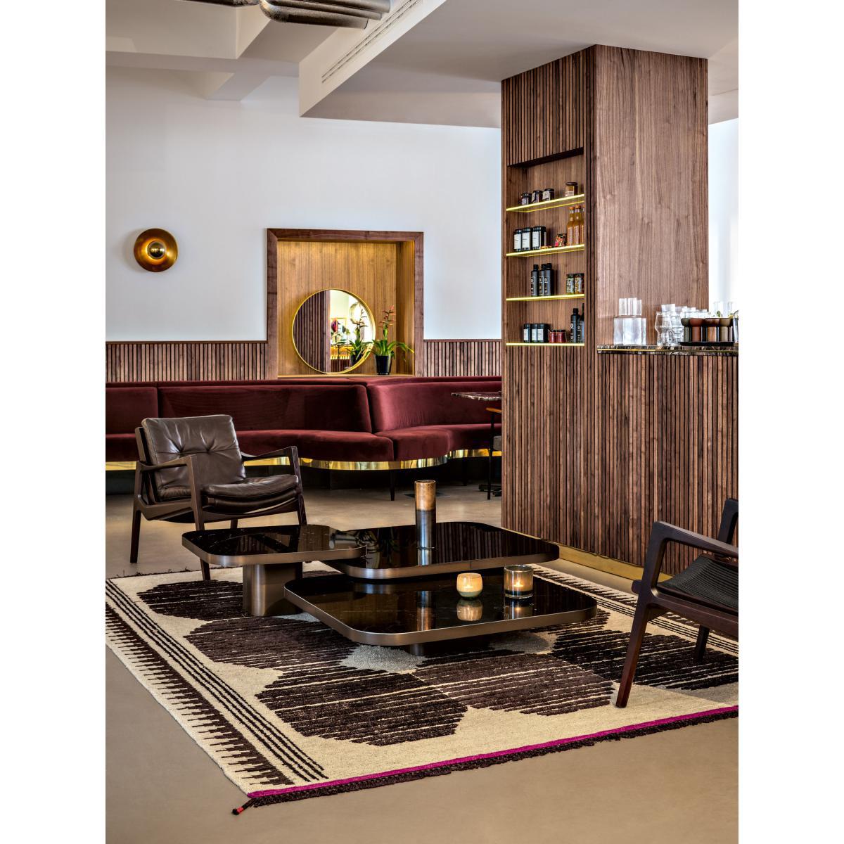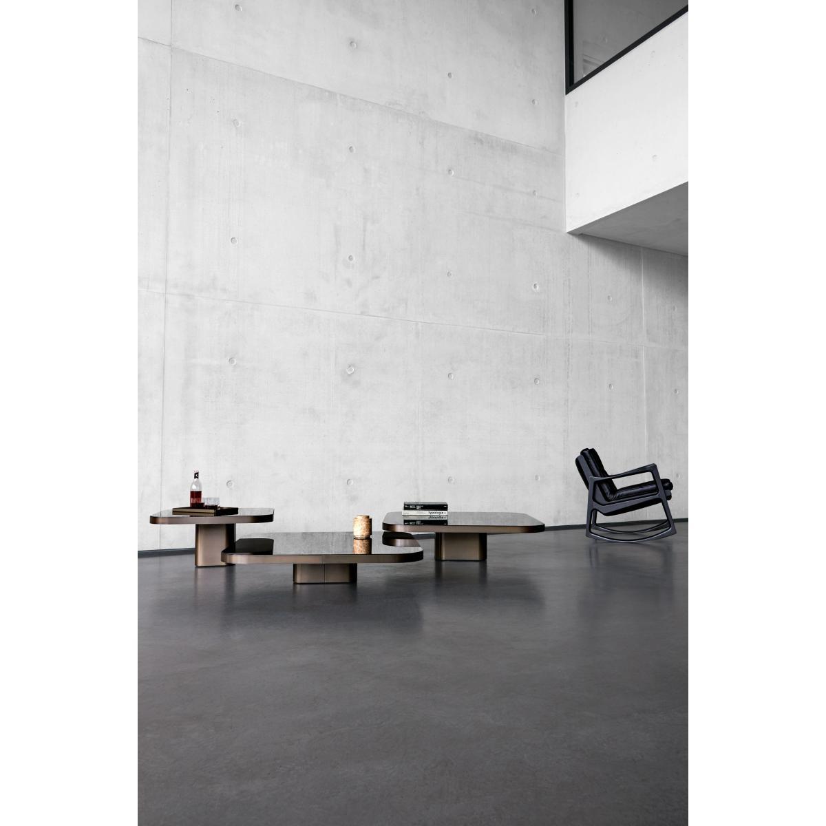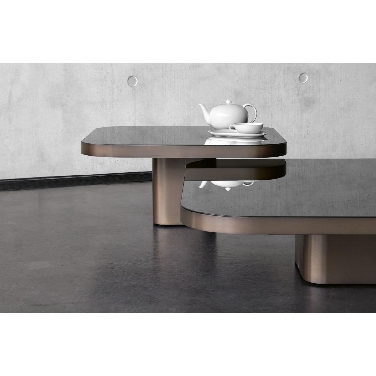 A coffee table inspired by the 70s. , This is what the Brazilian designer, Guilherme Torres is offering us with Bow n°3, characterised by its elegance, its gentle shapes and its rounded angles. This coffee table is made up of a burnished brass structure and a black glass top for an absolutely divine finish. Its metallic surface evokes the futurist designs imagined during the 70s, while enjoying a very modern design. Endowed with a sculptural outline, Bow n°3 gives your room some character. For an even more majestic and original effect, the set of tables from the Bow collection can be put together and harmoniously placed on top of one another to form a set at different levels.