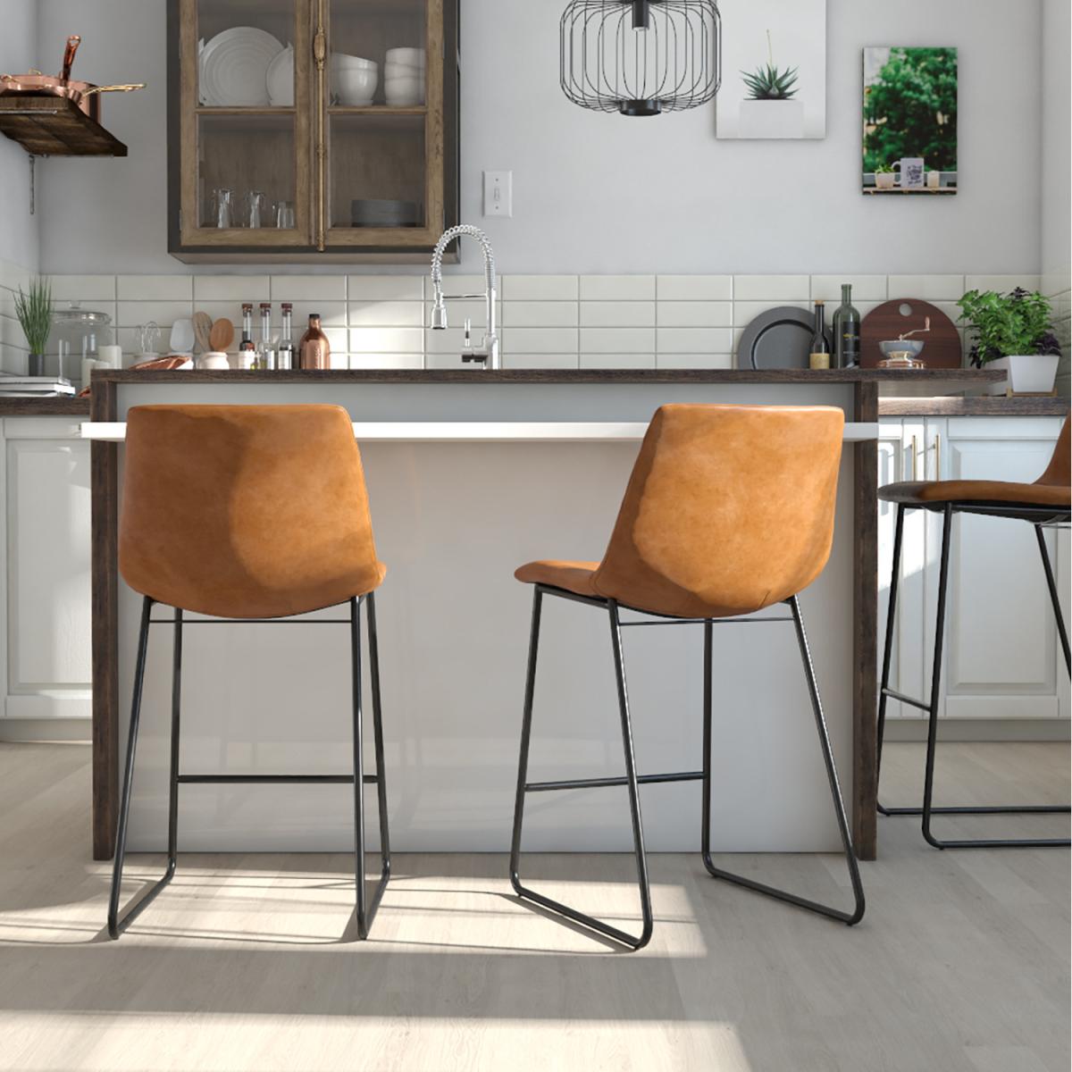 I’m a big fan of this caramel PU counter stool for its blend of comfort and clean-lined style. The warm hue of the faux leather and slim black metal frame suit contemporary, Scandi-inspired or industrial kitchens equally well, and the seat height works perfectly at most breakfast bars or kitchen islands. For practical styling, team it with a light oak or white marble counter to keep things fresh, then anchor with a simple wool runner or low-pile rug beneath. A slender cushion or lumbar pad in neutral linen won’t hide the seat’s shape but will add extra comfort for longer chats.