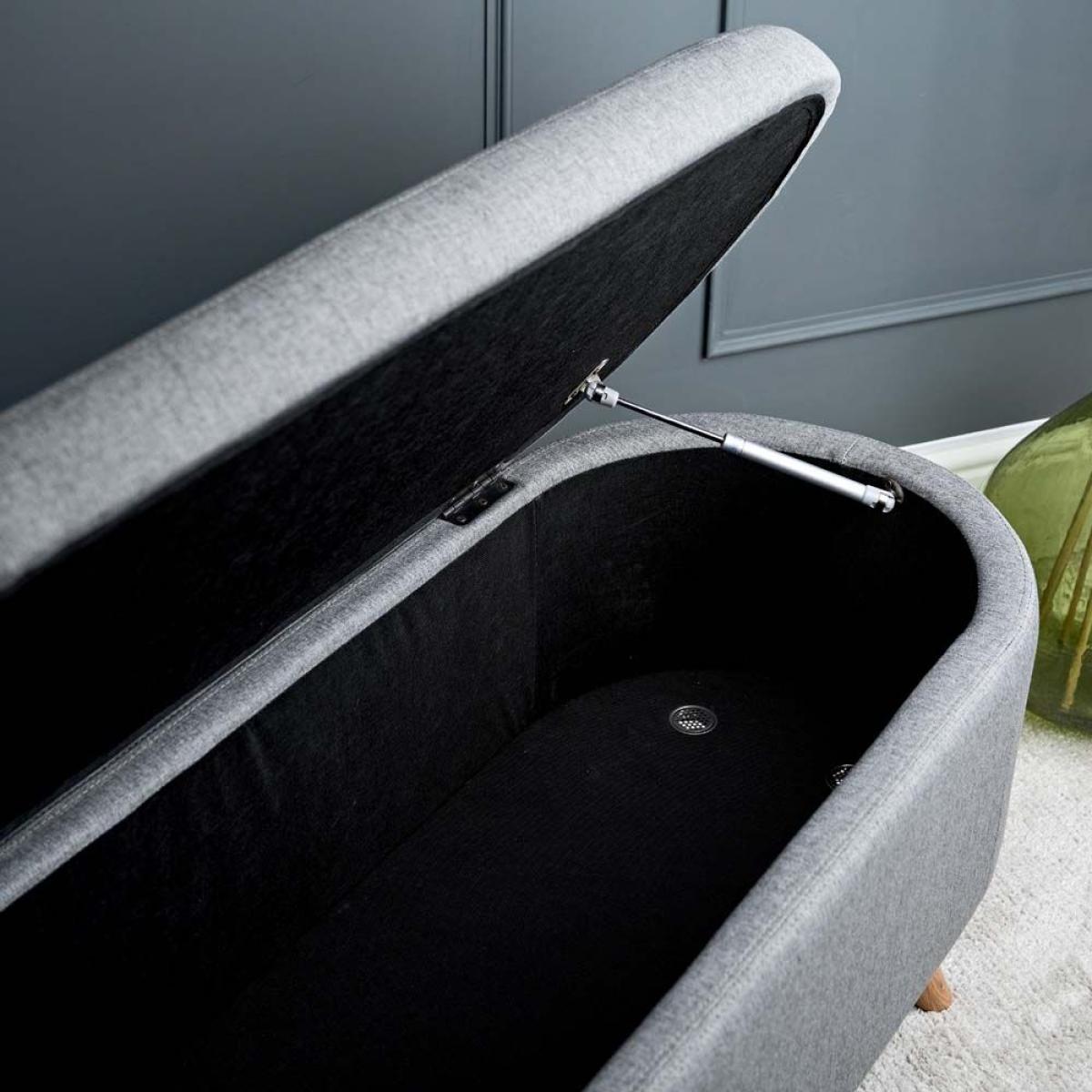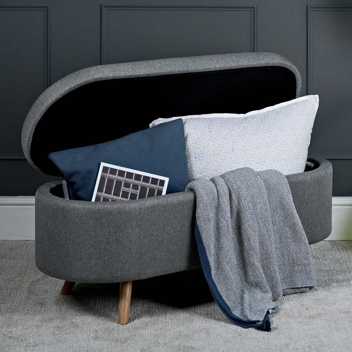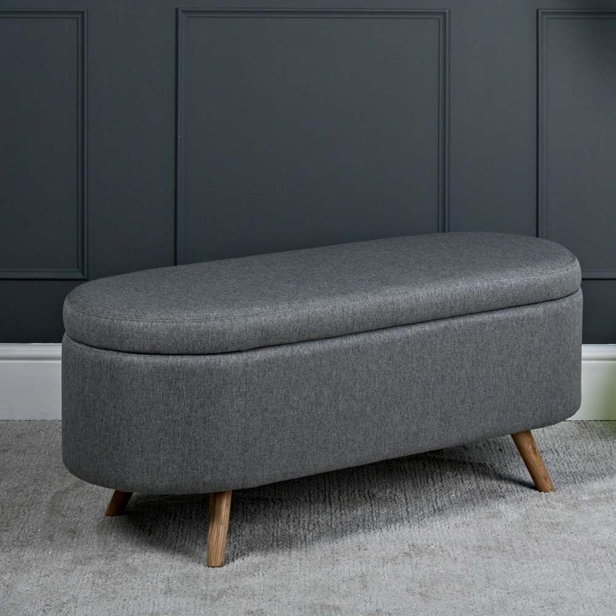 The Bowden Ottoman is a fully upholstered storage box with curved ends which is great as blanket box in the bedroom or even as an additional seat below a window in the sitting room. The upholstery is in a neutral grey tone, and the lid features safe and secure hydraulic supports to assist with opening and prevent it closing unexpectedly. The ottoman is finished with solid oak legs.