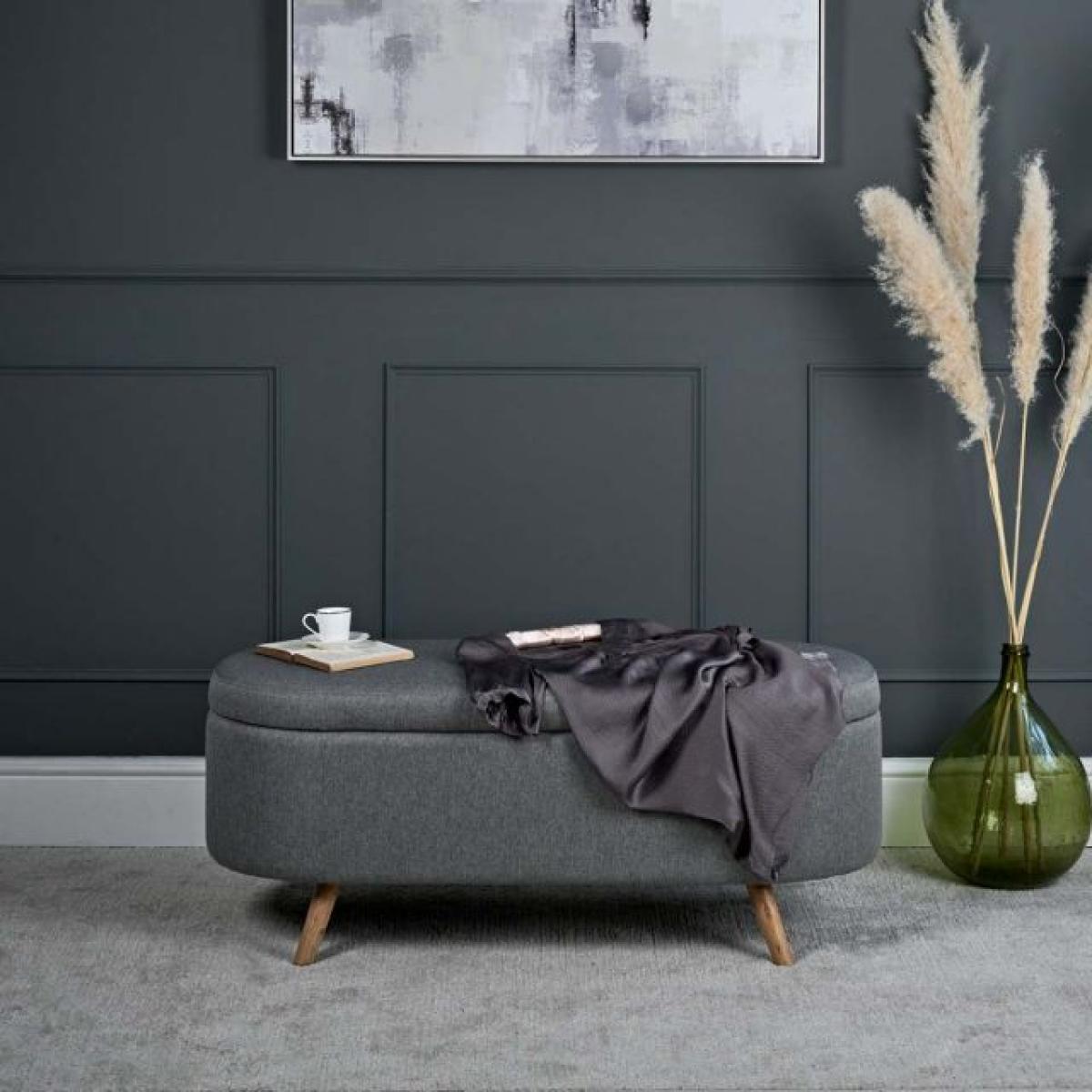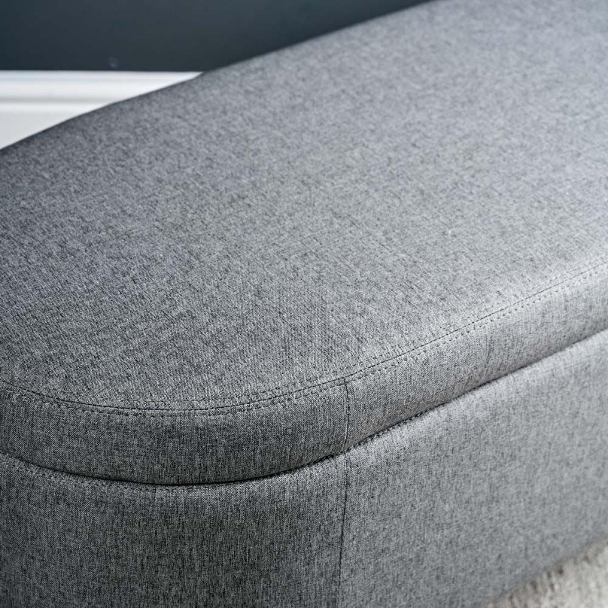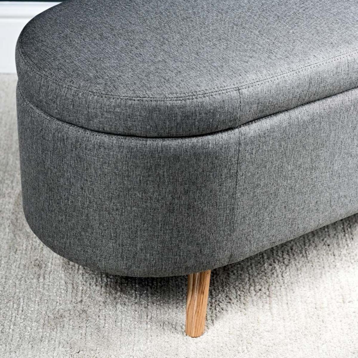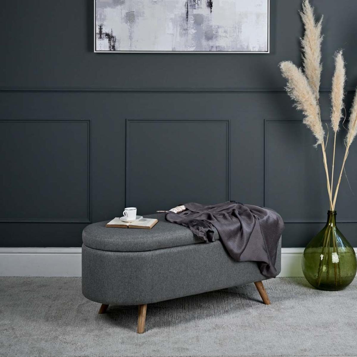 The Bowden Ottoman is a fully upholstered storage box with curved ends which is great as blanket box in the bedroom or even as an additional seat below a window in the sitting room. The upholstery is in a neutral grey tone, and the lid features safe and secure hydraulic supports to assist with opening and prevent it closing unexpectedly. The ottoman is finished with solid oak legs.