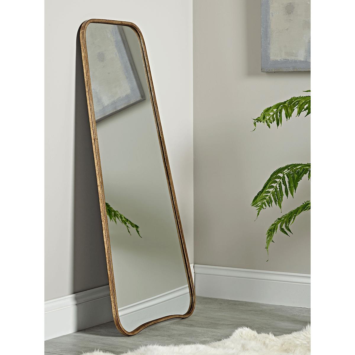 A beautifully feminine twist on traditional full length mirrors, this simple, elegant design has a slender, burnished brass frame and curved bottom edge. Also available in Black.