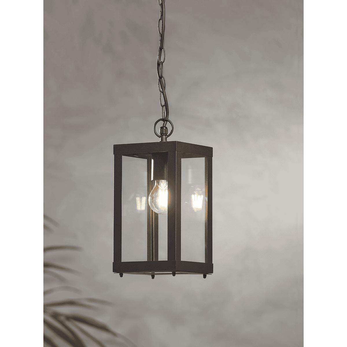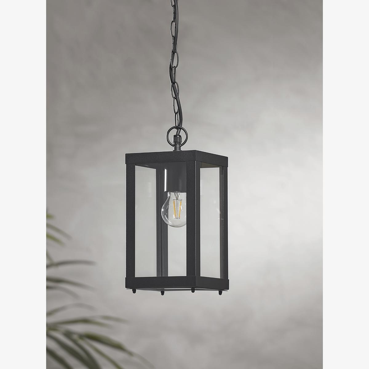 A strikingly simple pendant, perfect for hallways and porches, or indeed anywhere that would be enhanced by this sleek industrial hanging lantern. A bold metal box frame encases clear glass in this pendant which is supported by a matching chain and ceiling rose. Discover how to create the perfect lighting scheme for your home using our Lighting Buying Guide.
