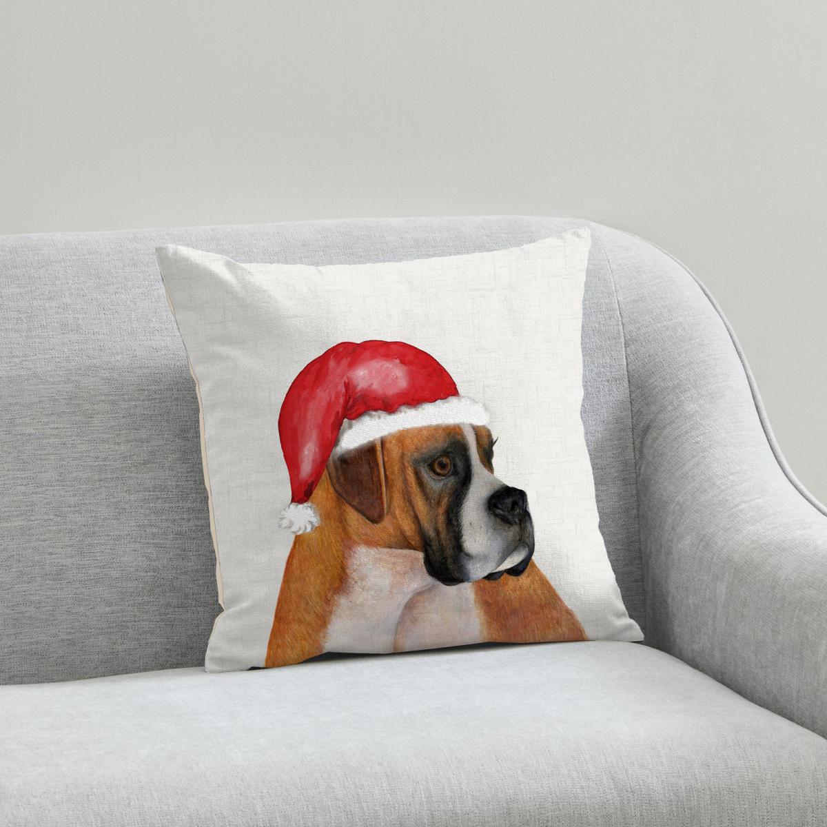 Boxer Christmas Hat Cushion White, Brown and Red