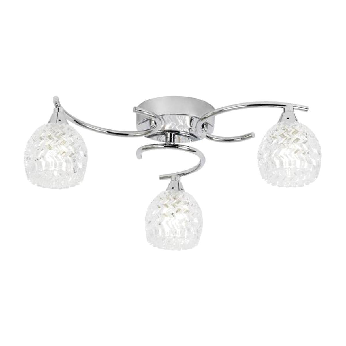 A 3 light flush ceiling fitting with curved metal arms in a chrome finish and cut glass shades. suitable for use with LED lamps and dimmable. Matching items and other colour options available.