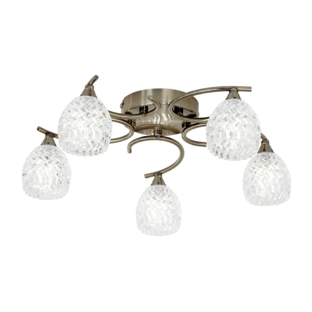 A 5 light flush ceiling fitting with curved metal arms in an antique brass finish, and cut glass shades. Suitable for use with LED lamps and dimmable. Matching items and other colour options available.