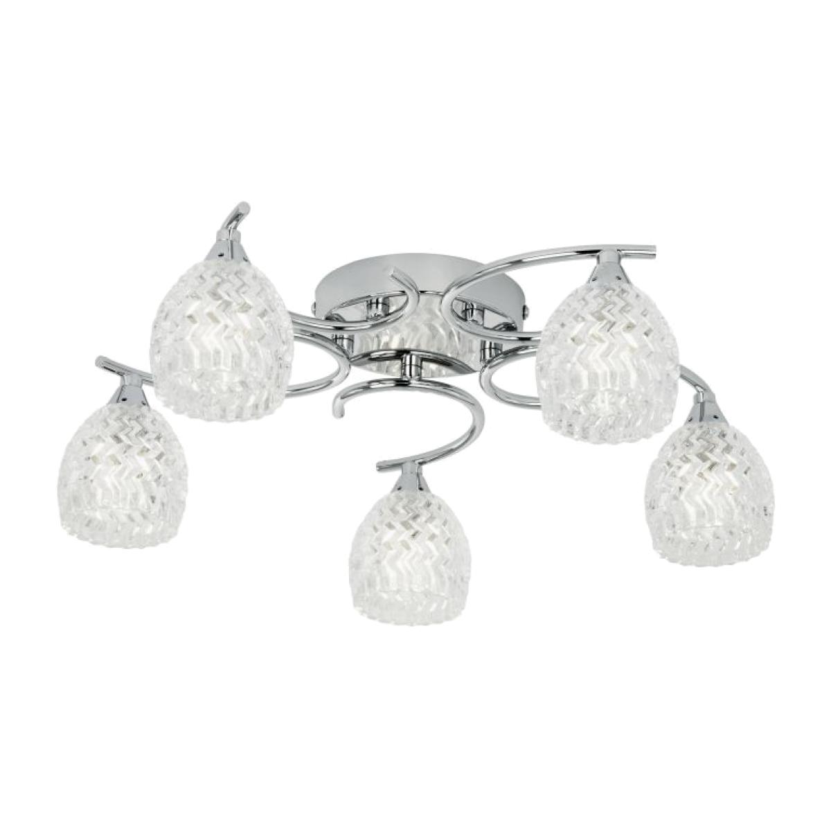 A 5 light flush ceiling fitting with curved metal arms in a chrome finish, and cut glass shades. Suitable for use with LED lamps and dimmable. Matching items and other colour options available.