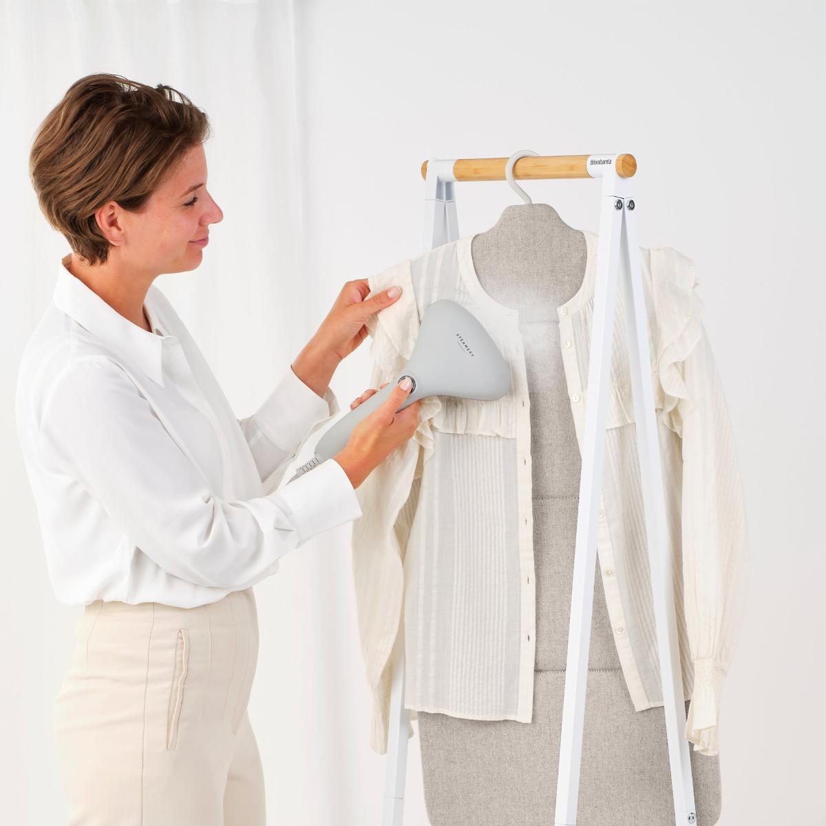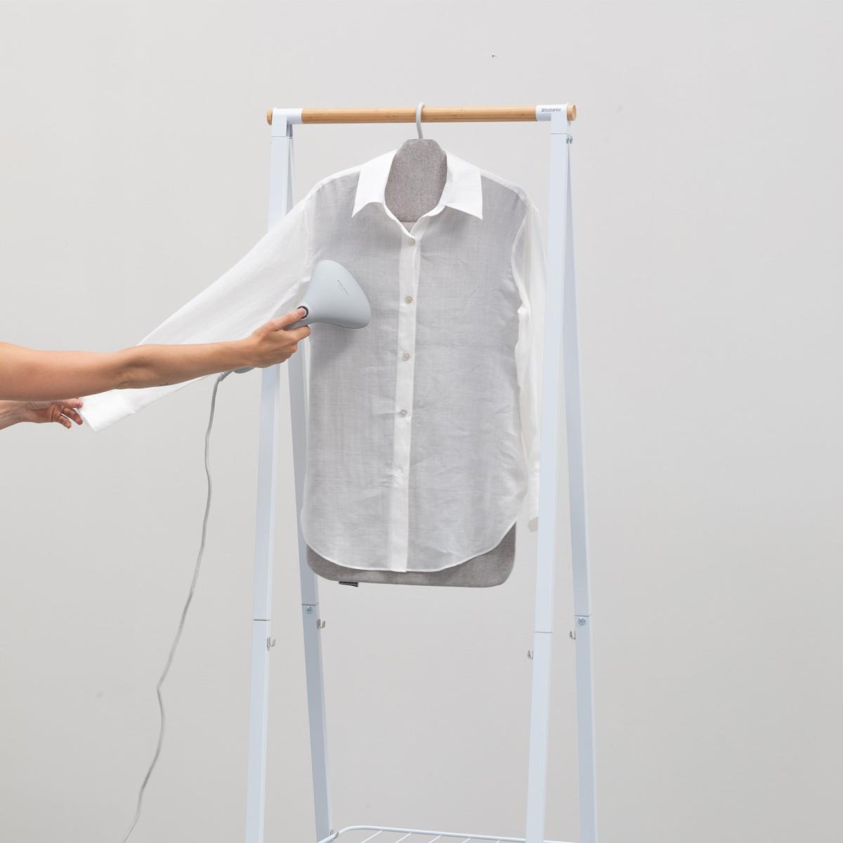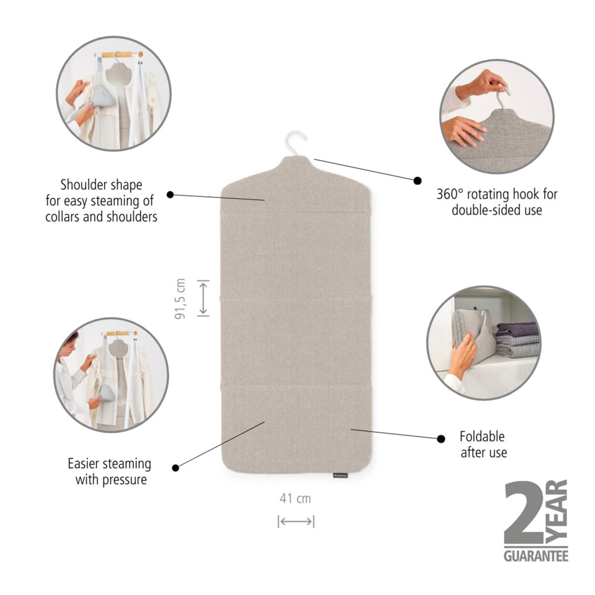 * Solid surface for easy steaming* 360° rotating hook* Double-sided use* Compact storage* 2 year guarantee Streamline your steaming routine with the Brabantia foldable steam board. The solid surface ensures faster and more effective steaming, and the 360° rotating hook adds versatility. The smart shoulder shape simplifies steaming collars and shoulders, and double-sided use allows you to steam both front and back separately. After use, fold it away for compact storage. Experience problem-free usage with a 2-year guarantee and service.