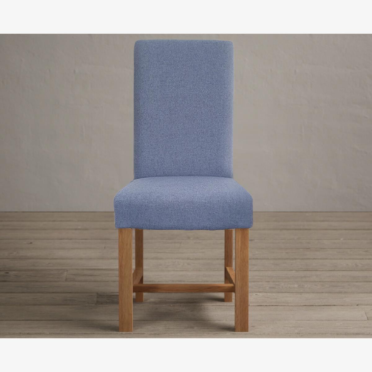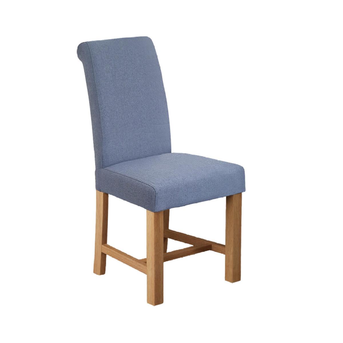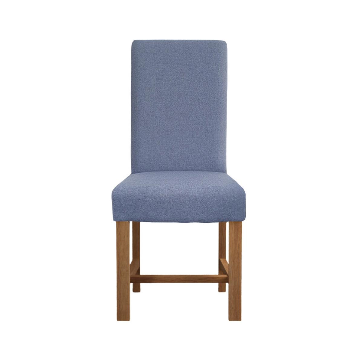 Braced Leg Blue Fabric Dining Chairs feature solid oak legs and chic blue fabric upholstery, perfect to match with your oak dining table.