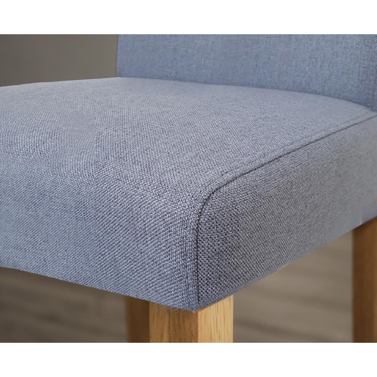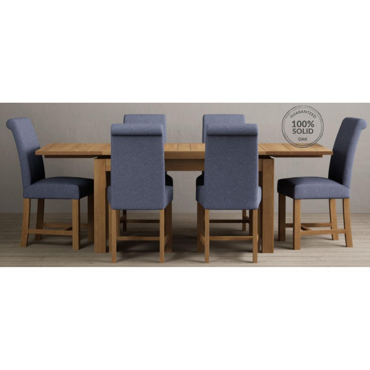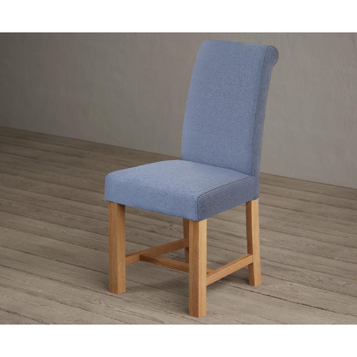 Braced Leg Blue Fabric Dining Chairs feature solid oak legs and chic blue fabric upholstery, perfect to match with your oak dining table.