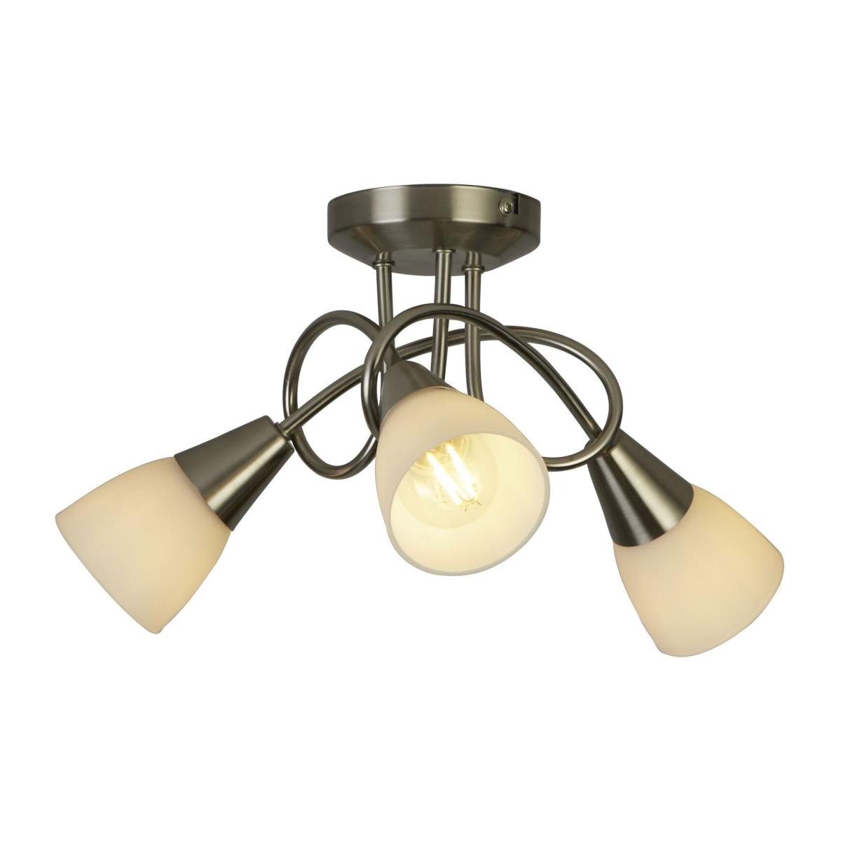 Twisted brushed silver metal provides 3 arms for beautiful frosted white shades. Although contemporary in design this ceiling light would suit both modern and traditional interiors.