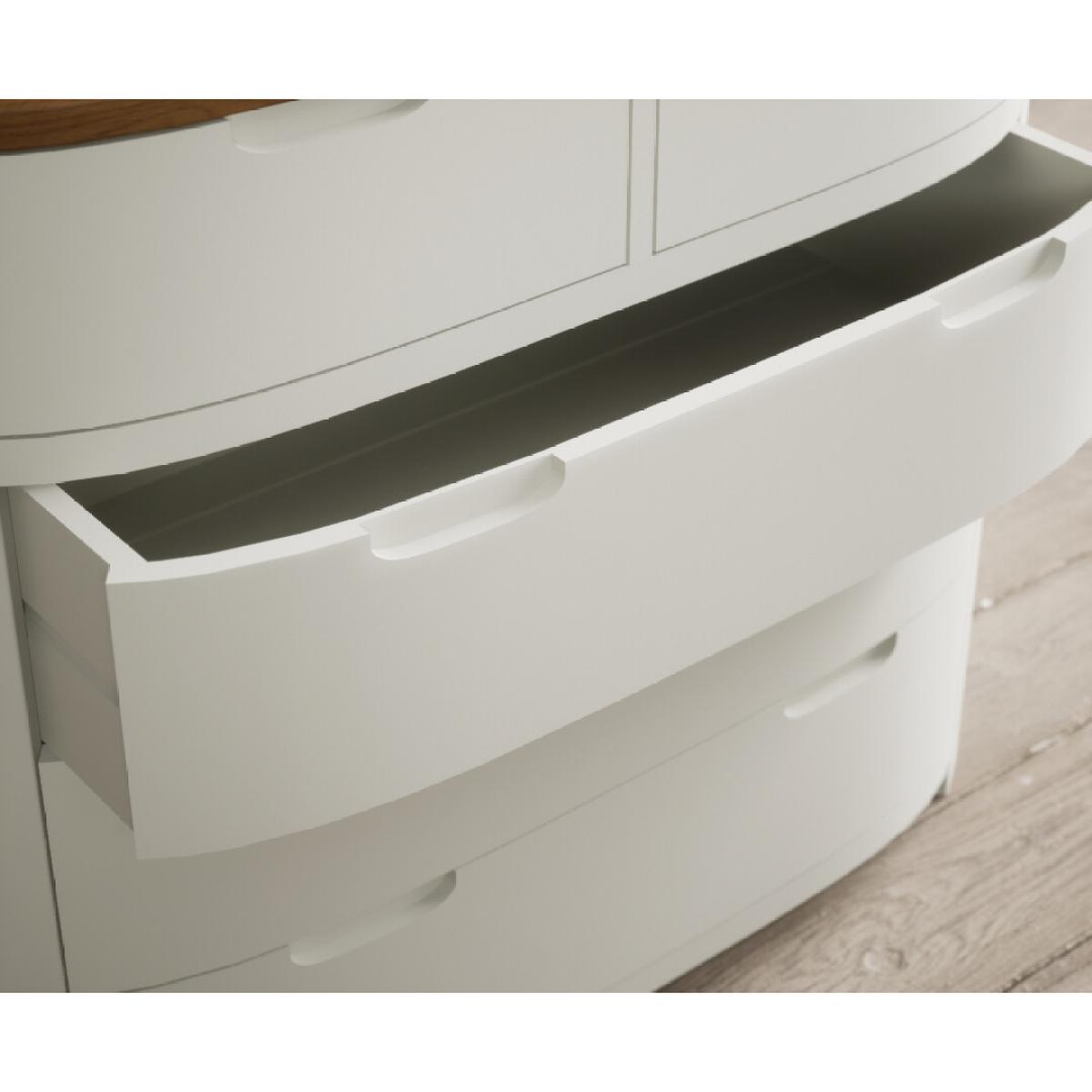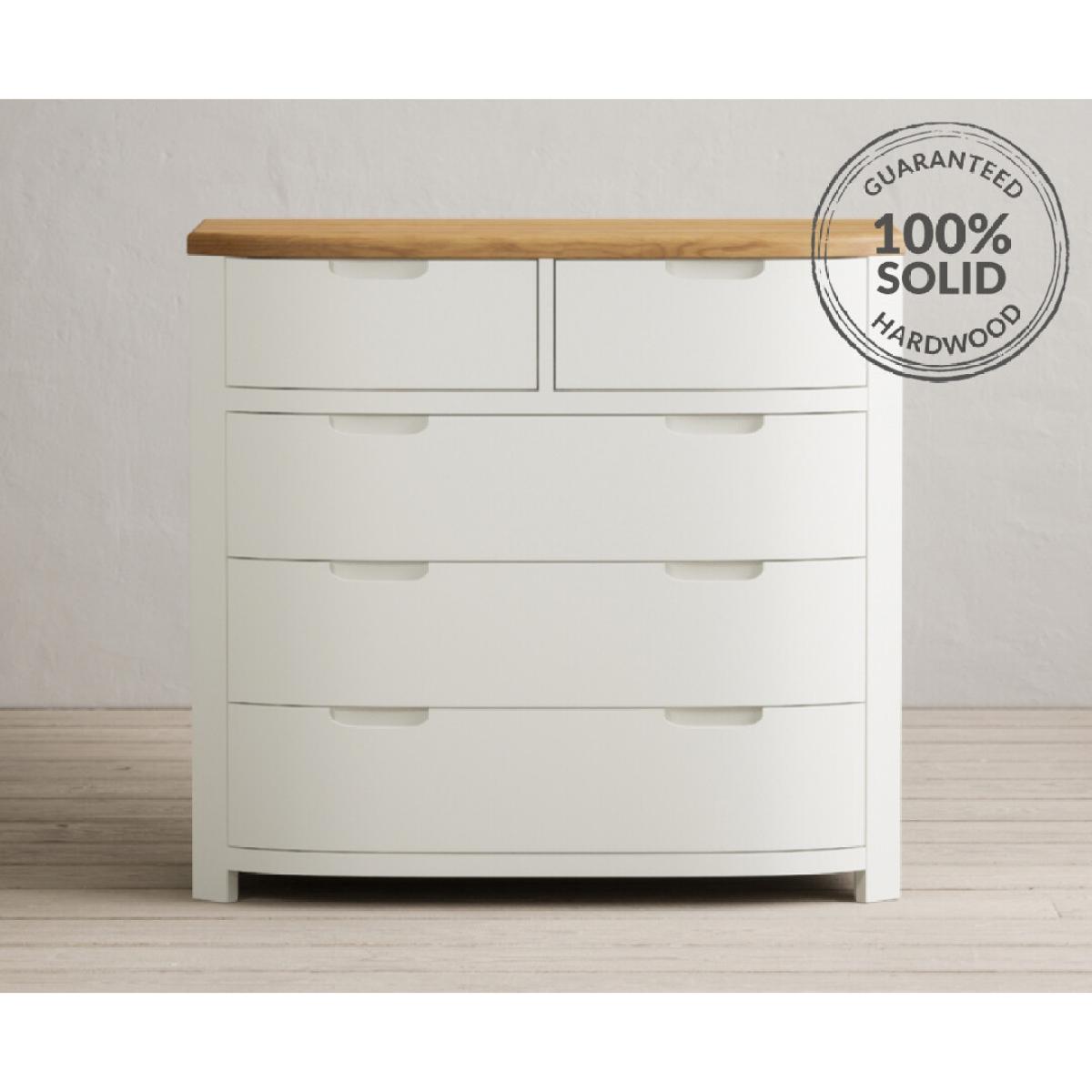 The Bradwell Oak and Signal White Painted 2 Over 3 Chest of Drawers is crafted from solid hardwood with a Signal White painted finish, topped with 100% solid oak, with 5 Dovetail drawers.