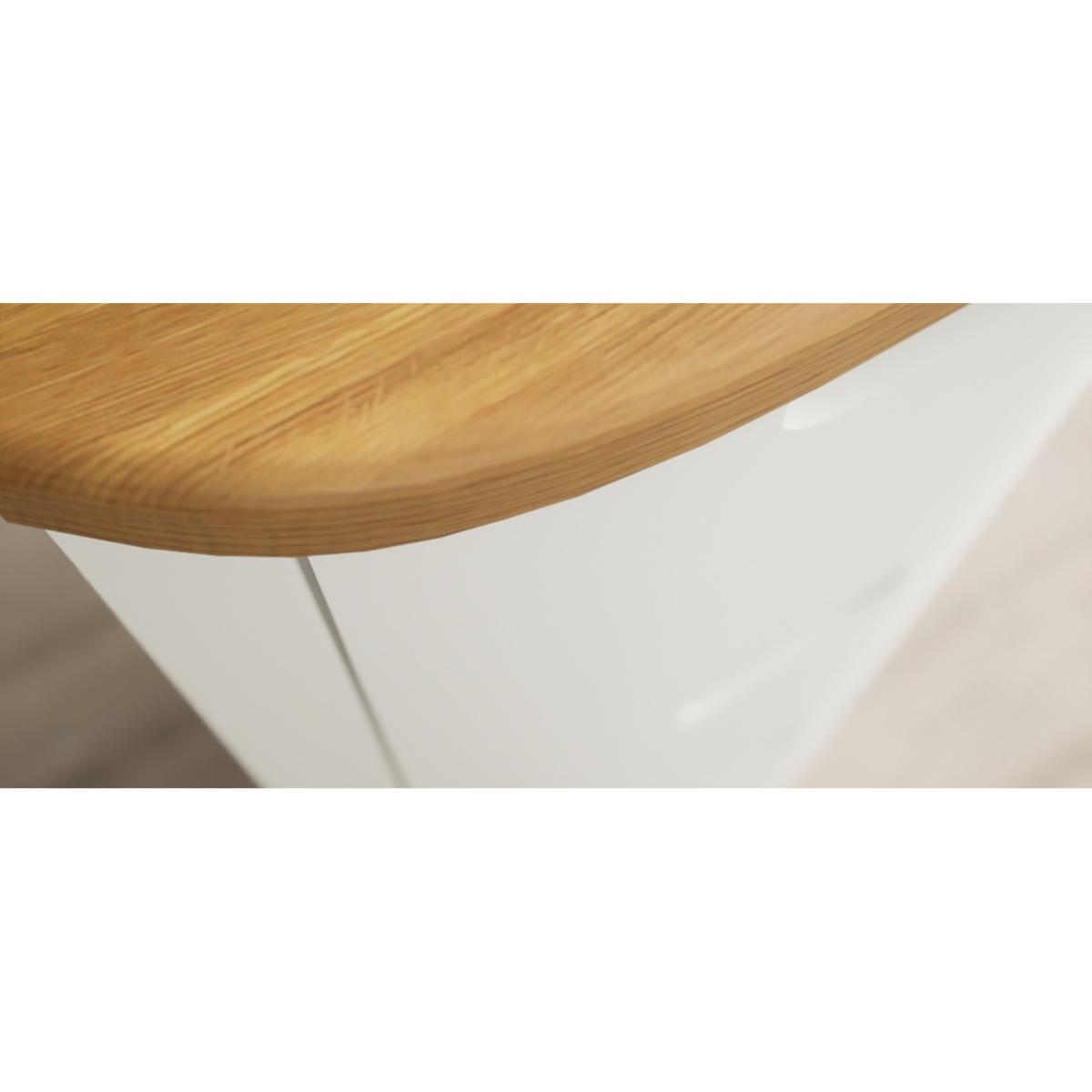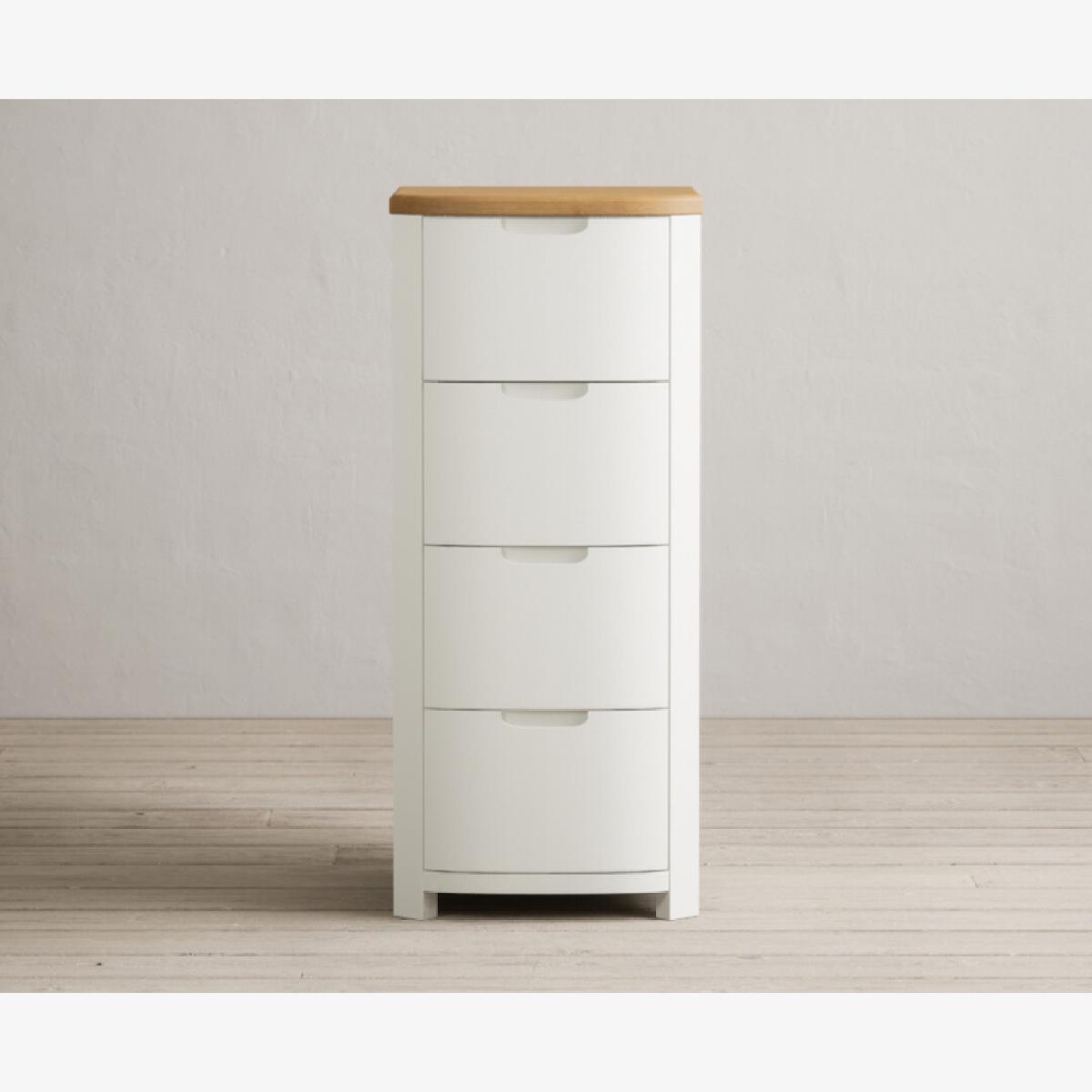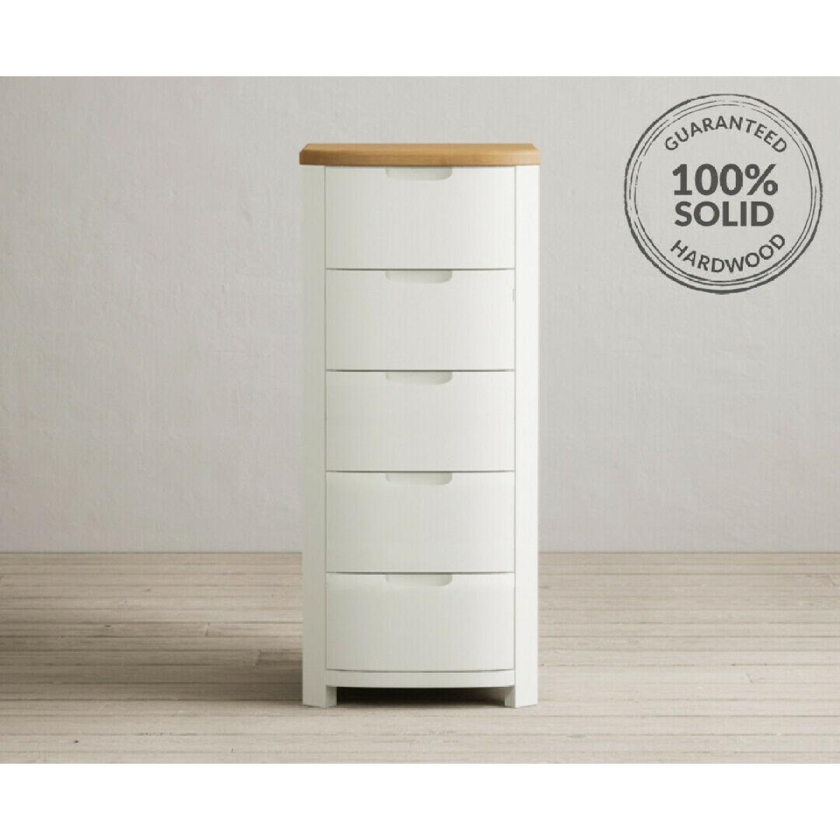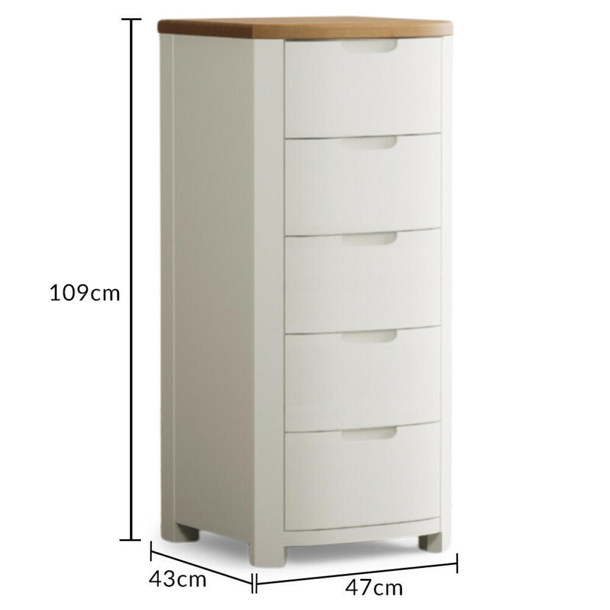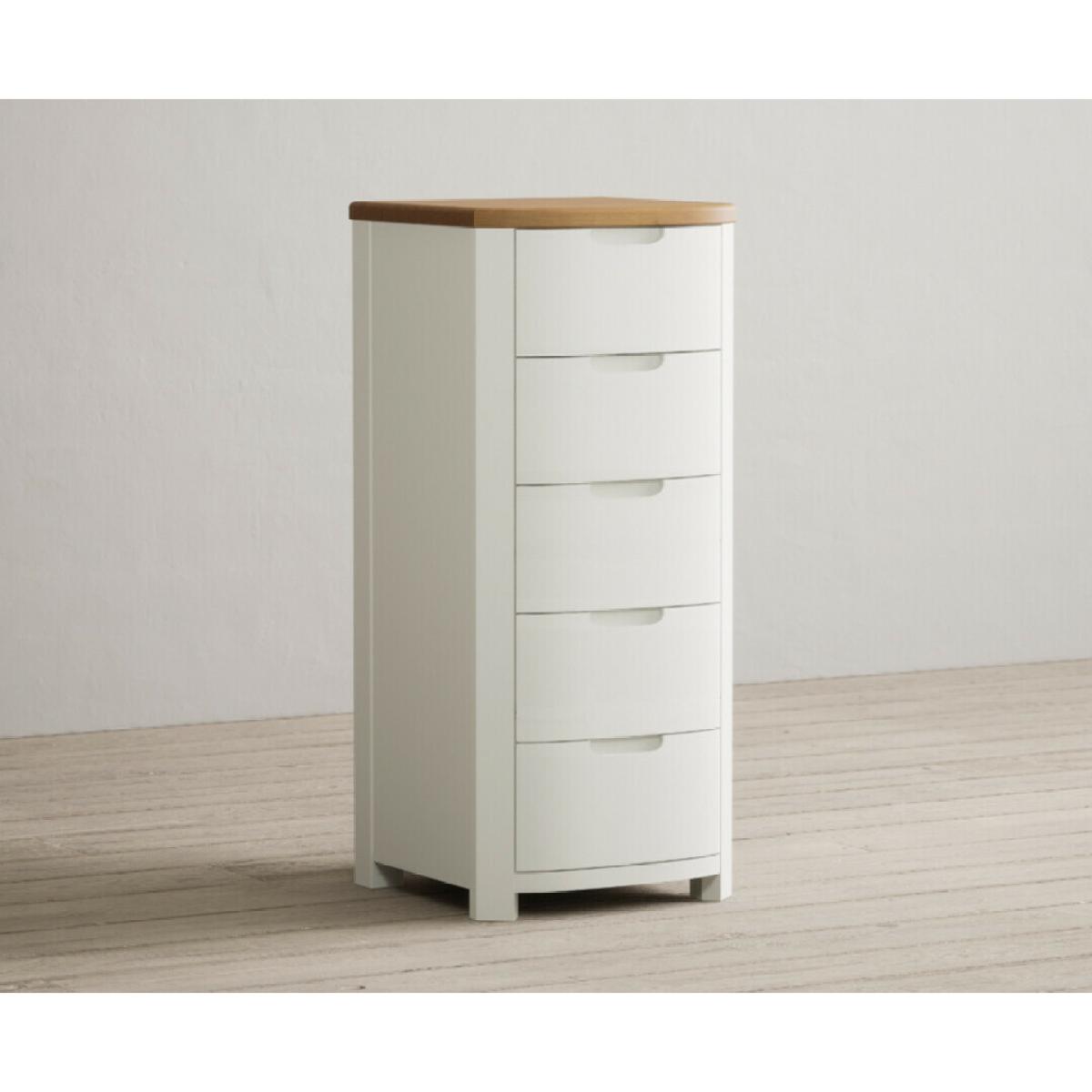The Bradwell Oak and Signal White Painted 5 Drawer Tallboy Chest is crafted from solid hardwood with a white painted finish, topped with 100% solid oak.