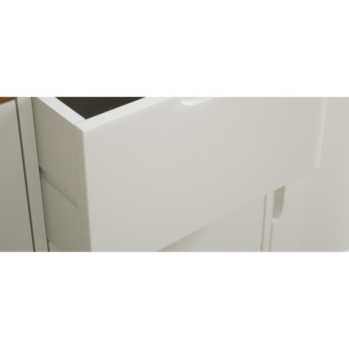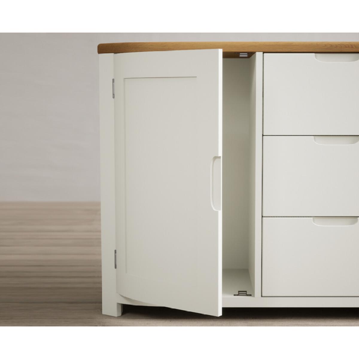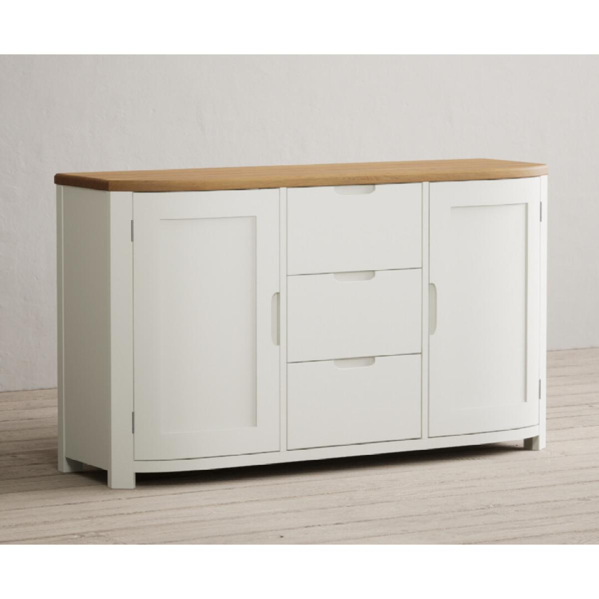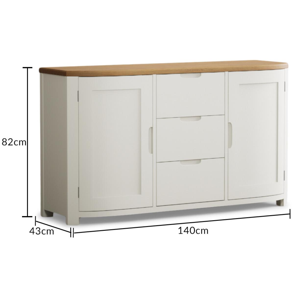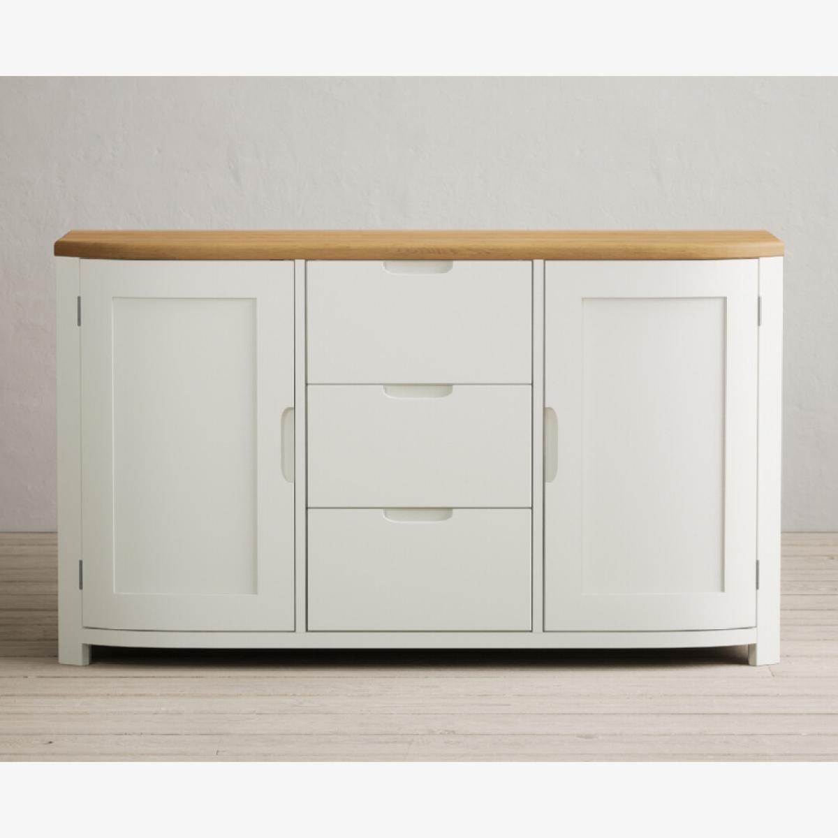 The Bradwell Oak and Chalk White Painted Large Sideboard features a white painted solid hardwood frame and solid oak top, with Dovetail drawers and recessed handles.