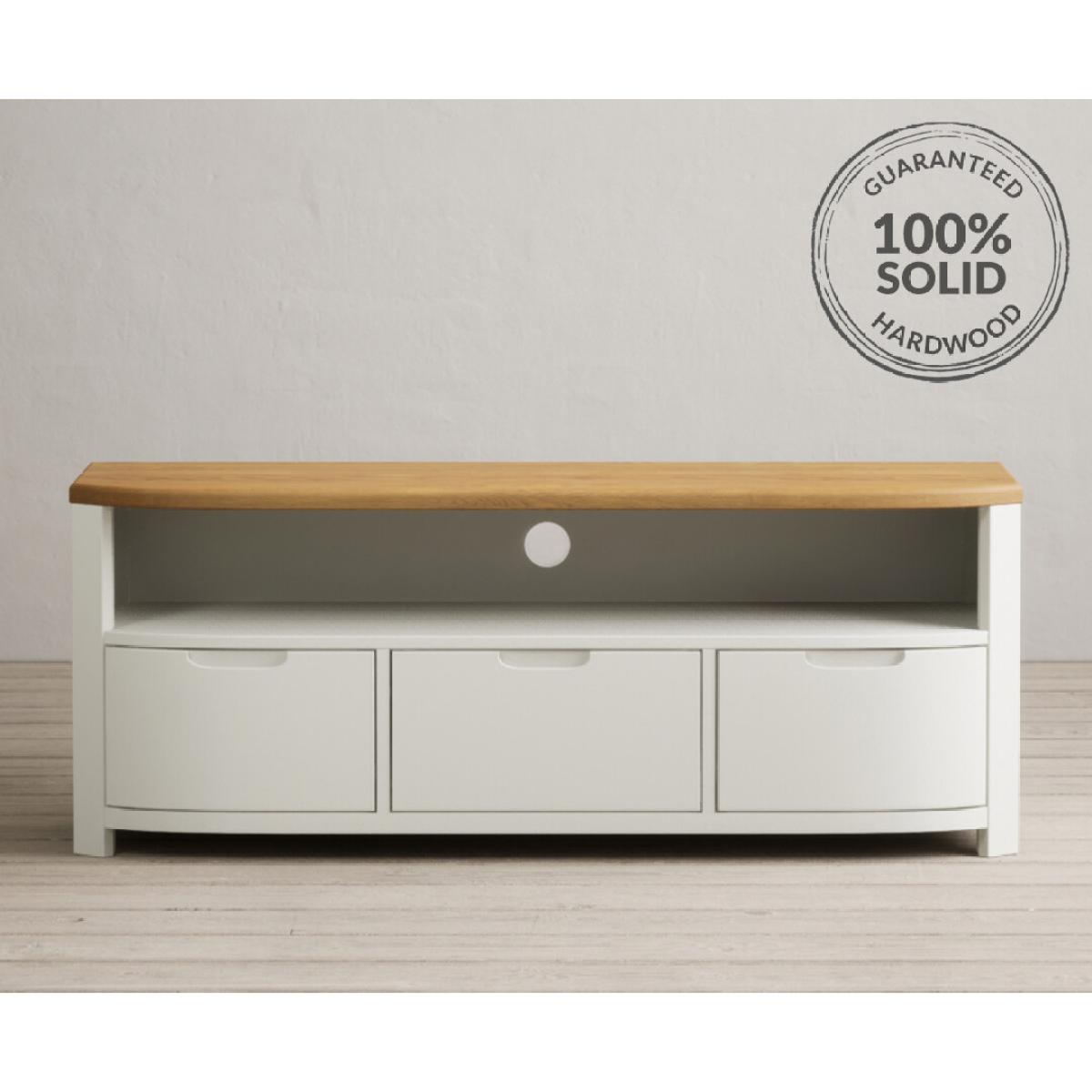The Bradwell Oak and Chalk White Painted Large TV Cabinet is crafted from white painted solid hardwood and topped with solid oak with a rustic finish.