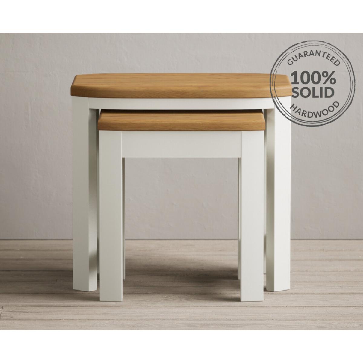 The Bradwell Oak and Chalk White Painted Nest of Tables is a set of two versatile tables with chalk-white painted solid hardwood frames and solid oak tops.
