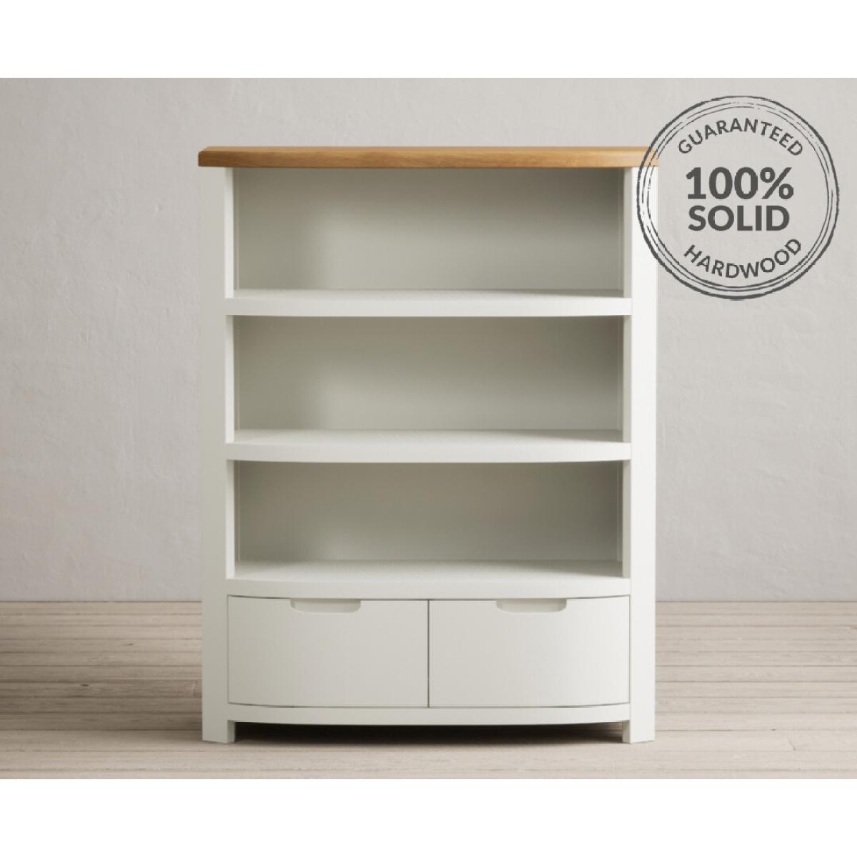 The Bradwell Oak and Chalk White Painted Small Bookcase is crafted from white painted solid hardwood, with sturdy shelves and a solid oak top.