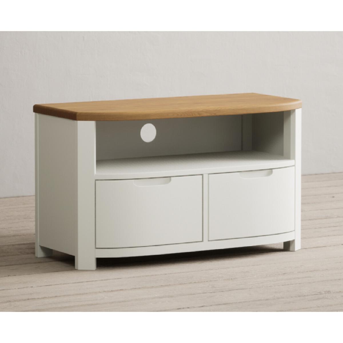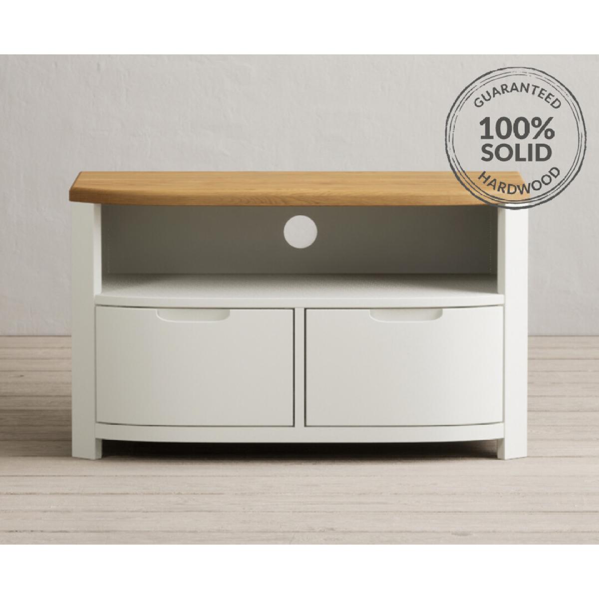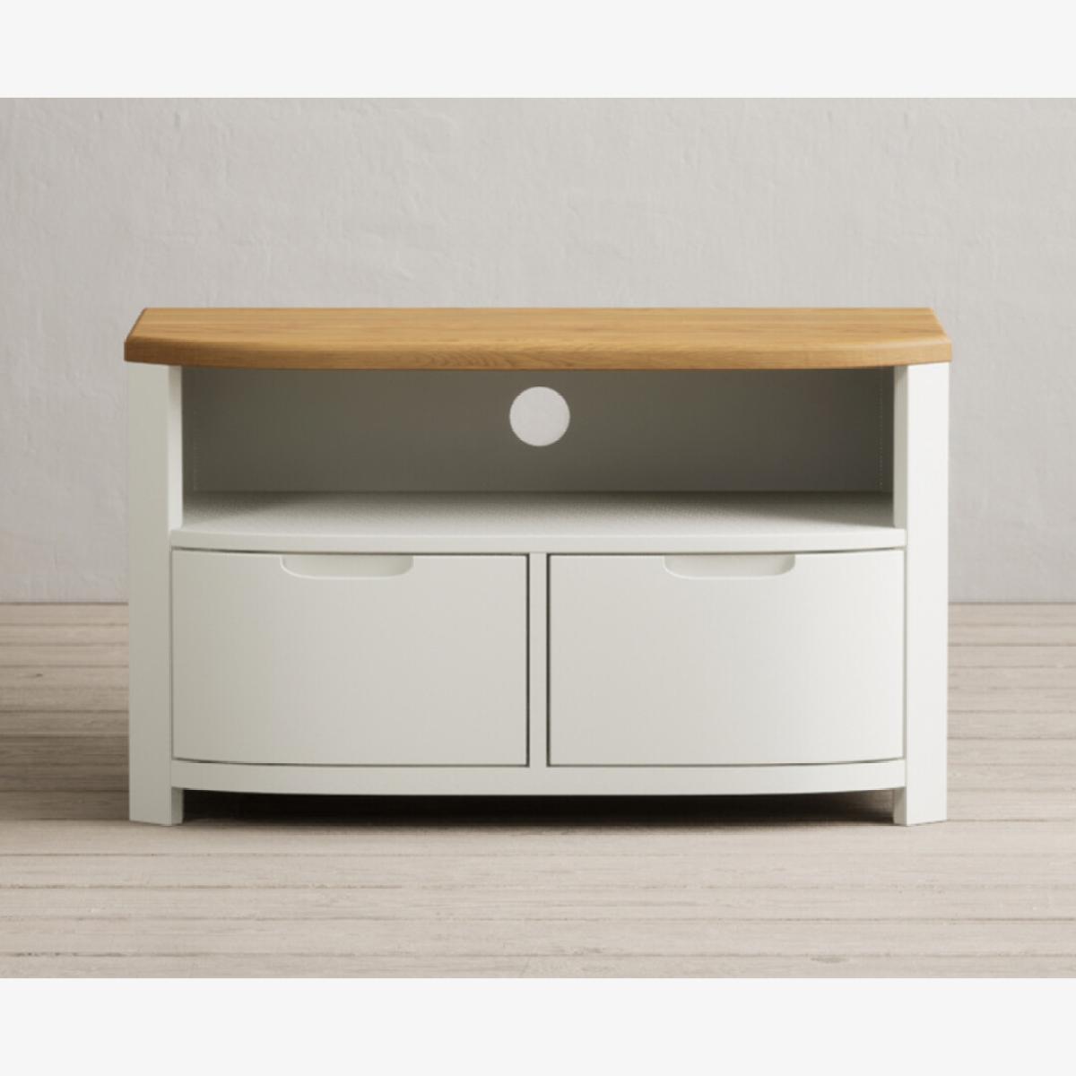 The Bradwell Oak and Chalk White Painted Small TV Cabinet is crafted from white painted solid hardwood and topped with solid oak with a rustic finish.