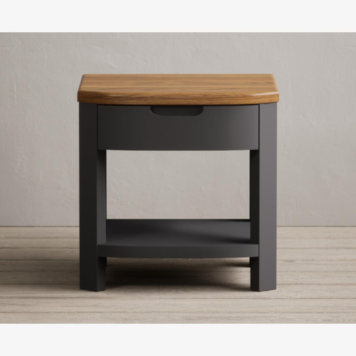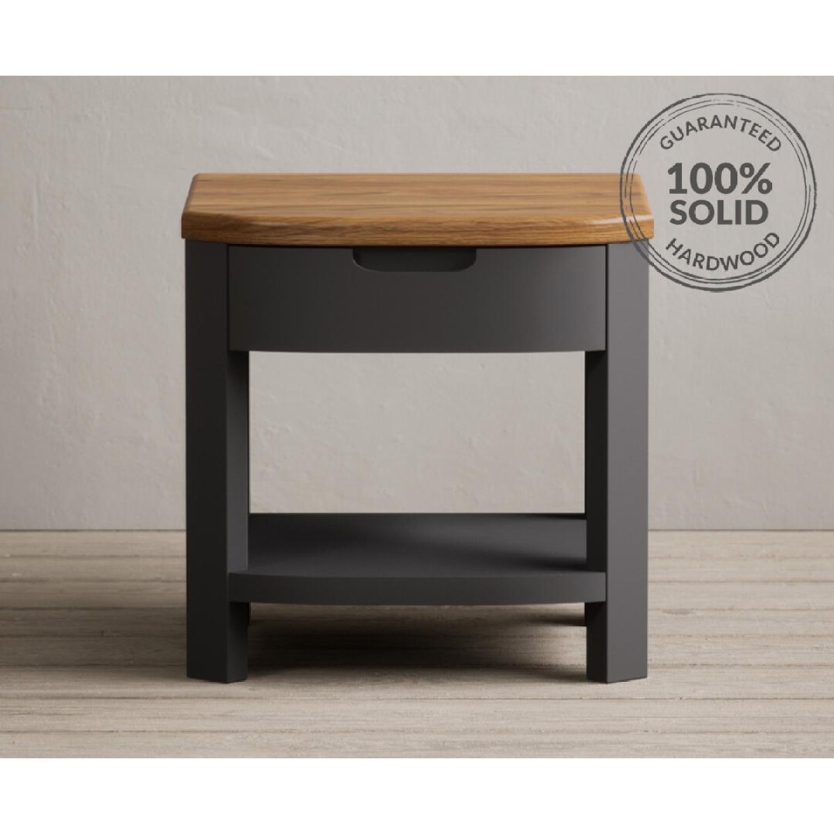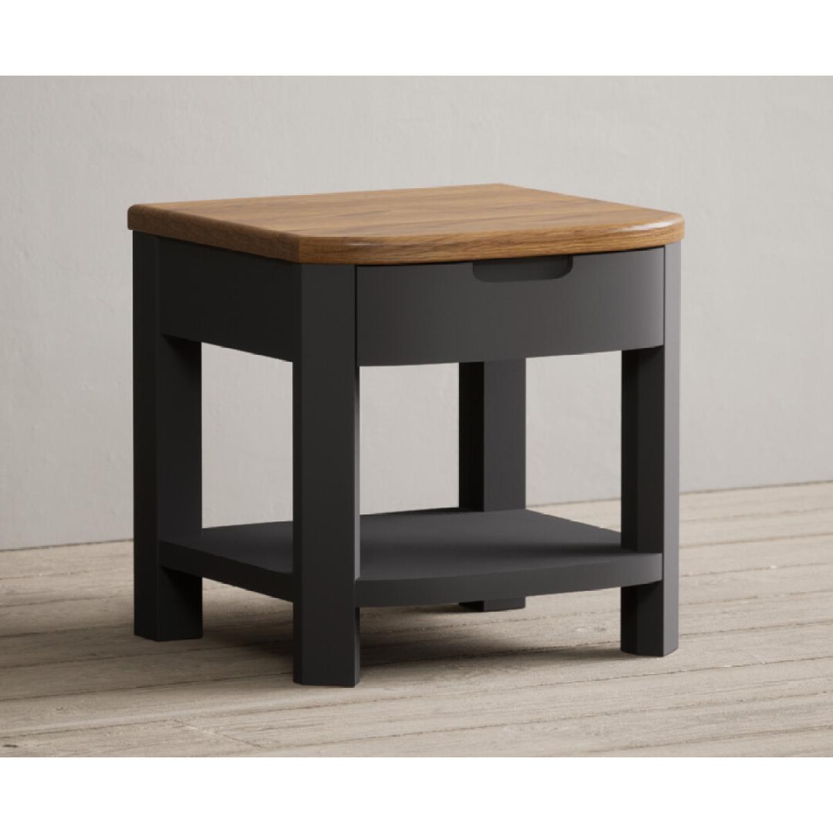 The Bradwell Oak and Charcoal Grey Painted 1 Drawer Lamp Table is crafted from solid hardwood with a grey painted finish, topped with rustic 100% solid oak.