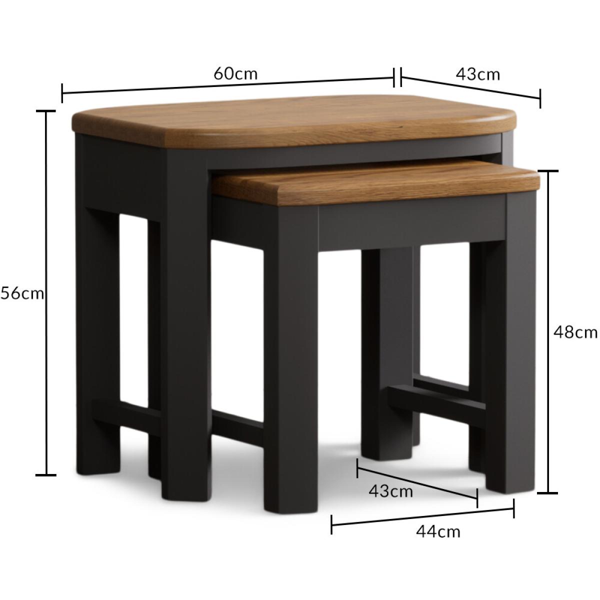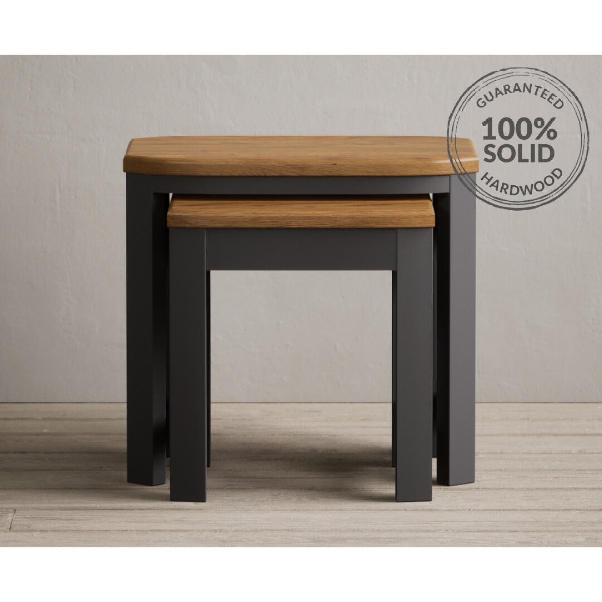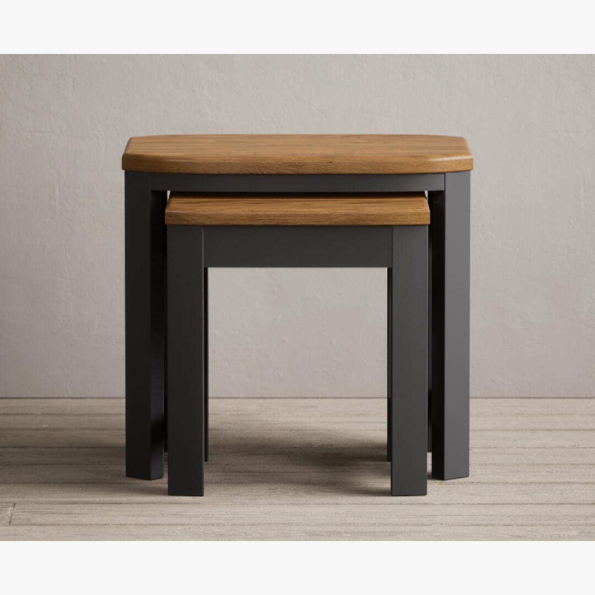 The Bradwell Oak and Charcoal Grey Painted Nest of Tables is a set of two versatile tables with charcoal-grey painted solid hardwood frames and solid oak tops.
